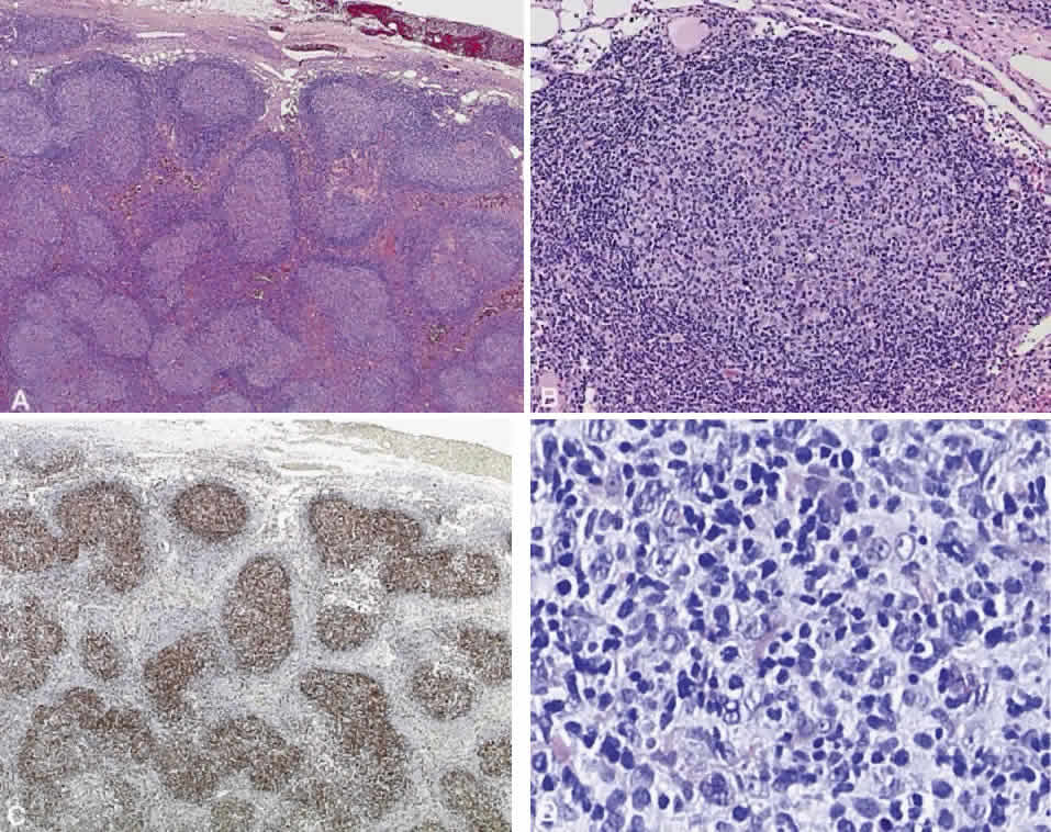 AILD, ; CLL, chronic lymphocytic leukemia; HTLV1, human T-lymphotropic virus type 1; LgX, ; NK, natural killer; REAL, revised European—American Lymphoma classification. (Chan JKC, Banks PM, Cleary ML et al: A proposal for classification of lymphoid neoplasms (by the international Lymphoma Study Group). Histopathology 25:517, 1994)