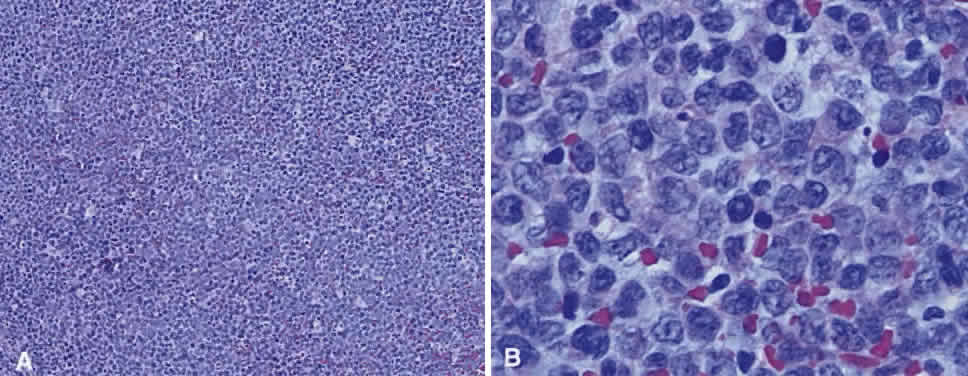 EXTRANODAL B-CELL MARGINAL ZONE LYMPHOMA Mucosa-associated lymphoid tissue normally is found in the conjunctiva and lacrimal gland, but not in the orbit, and conjunctival MALT secretes IgG, whereas the lacrimal gland produces IgA; the latter is bound to a secretory component made by lacrimal gland MALT and subsequently secreted into the tear film.69 Both conjunctival and lacrimal gland MALT contribute lysozyme to the tear film.69 MALT is the immune secretory system also found in the tracheobronchial tree, salivary gland, thyroid gland, gastrointestinal tract, and breast, and lymphoma of MALT has been incorporated for the first time by the REAL classification and termed extranodal marginal zone B-cell lymphoma, which occurs in the extranodal areas mentioned earlier as well as in the orbit.26,70 Extranodal B-cell marginal zone lymphoma in the stomach has been associated with Helicobacter pylori infection in as many as 90% of patients, and the lymphoma has been shown to respond in most ofthese cases to antibacterial therapy.71–74 The association appears to occur in the presence of reactive T-cell activity in H. pylori infection.74 Other inflammatory conditions may mediate lymphomatous transformation elsewhere.75–79 There has been an association of extranodal B-cell marginal zone lymphoma in patients with the myoepithelial sialoadenitis of Sjögren's syndrome and the thyroid inflammation of Hashimoto's thyroiditis.80,81 This type of lymphoma likely arises secondary to preexisting local chronic inflammation of underlying etiology, whether infectious, autoimmune, or undetermined. Extranodal B-cell marginal zone lymphoma histologically can consist of small to medium-sized centrocyte-like lymphocytes, which originate from the marginal zone of the follicle or can be polymorphous with cells ranging from small lymphocytes to plasmacytoid cells, which then either invade the interfollicular area and the overlying epithelium or invade the central follicle (Fig. 9). This variable pattern has likely contributed to the delay in recognition of the entity. High-grade extranodal B-cell marginal zone lymphoma may destroy the follicular structure completely. Most extranodal B-cell marginal zone lymphoma of the ocular adnexa are low-grade lesions, although systemic involvement or transformation to large cell lymphoma can occur.26,82 FOLLICLE CENTER CELL LYMPHOMA Follicle center cell lymphoma occurs in adulthood, and deposits in the orbit usually are an indicator of disseminated disease. Primary extranodal disease in the orbit is uncommon. This disease may be relatively indolent but difficult to cure. Some cases may progress to large cell lymphoma. Histologically, the tumor usually has a follicular growth pattern, although a diffuse growth component also may be present. The abnormal follicles lack tingible body macrophages and contain a variable mixture of follicle center cells (centrocytes and centroblasts—cleaved and noncleaved cells). The derivation of these abnormal follicles from normal follicles is suggested by the expression of CD10. In contrast to normal reactive follicles, the center of abnormal follicles also expresses bcl-2 oncoprotein, a feature that is helpful in differential diagnosis (Fig. 10). B-CELL CHRONIC LYMPHOCYTIC LEUKEMIA/SMALL LYMPHOCYTIC LYMPHOMA B-cell chronic lymphocytic leukemia (B-CLL)/small lymphocytic lymphoma is predominantly a disease of the elderly whereby most present with leukemia involving the orbit. The term small lymphocytic lymphoma is reserved for cases in which there is no leukemia at presentation. Although this is a relatively indolent disease, it is virtually incurable with current therapy and may progress to a higher grade large cell lymphoma (Richter transformation). The histologic hallmark of this disease is a diffuse infiltrate of small lymphoid cells within which poorly defined pale-staining pseudofollicles of slightly larger cells are visible (proliferation centers). Immunophenotyping shows the abnormal lymphoid population to express CD5, CD23, and CD43 in addition to standard B-cell markers such as CD20 and CD79a. They do not express cyclin D1 (Fig. 11). LYMPHOPLASMACYTOID LYMPHOMA Lymphoplasmacytoid lymphoma also is a disease of the elderly in which a paraproteinemia is common, sometimes manifesting as a hyperviscosity state of visual and neurologic impairment and oozing from wounds (i.e., Waldenström's macroglobulinemia), for which the mean survival is 5 years.83 The optic nerve can be invaded by neoplastic plasma cells and lymphocytes or demonstrate papilledema from central nervous system invasion, and the tumor resembles lymphoma in its diffuse infiltration into lymphoid tissues.84 Like B-CLL, lymphoplasmacytoid lymphoma is rarely curable with available therapy. It usually affects the orbit as a component of systemic disease and also can transform to high-grade large B-cell lymphoma. In biopsy specimens, the infiltrate consists of a mixture of small lymphocytes, plasmacytoid lymphocytes, and plasma cells. Some abnormal cells contain intranuclear Dutcher and intracytoplasmic Russell bodies, which represent intracellular accumulations of immunoglobulin. When present, these features aid greatly in diagnosis. MANTLE CELL LYMPHOMA Another malignant lymphoma that predominantly affects older adults and usually is widely disseminated at presentation is mantle cell lymphoma. Again, this lymphoma usually affects the orbit as a component of systemic disease. On histologic examination, it consists of a diffuse infiltrate of small to medium-sized lymphoid cells with irregular, sometimes cleaved, nuclei with inconspicuous nucleoli and little cytoplasm (Fig. 12). Immunohistochemical analysis usually demonstrates the cells to be B cells that also express CD5 and CD43, but not CD23. These cells also typically express cyclin D1. LARGE CELL LYMPHOMA Of the malignant B-cell lymphomas, diffuse large B-cell lymphoma carries the worst prognosis for survival. In one series,