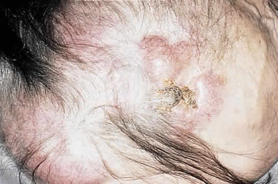 When an isolated mass of plasma cells occurs, it is referred to as a plasmacytoma, and these may occur in bone, where progression to multiple myeloma is most frequent, or extramedullary sites, which progress more rarely.100–104 Solitary conjunctival plasmacytoma requires observation for development of multiple myeloma (Fig. 16). Solitary plasmacytomas make up 3% to 5% of plasma cell tumors, and 25% of plasmacytomas have elevated IgM protein in the blood and urine. T-CELL LYMPHOMA T-cell lymphoma of the orbit is rare and usually occurs during the late stage of systemic disease or as a manifestation of mycosis fungoides. Only one case of primary T-cell lymphoma in the orbit has been described.105 Mycosis fungoides, a cutaneous T-cell lymphoma that spreads to lymph nodes and then to viscera, can invade the lids and conjunctiva, and even more rarely, the orbit106–109 (Fig. 17). Initially, the disease presents nonspecifically as an eczematous process, then to biopsy-positive indurated plaques, and then to cutaneous lesions and ulcerations, which, if large and exophytic, may appear fungal (Fig. 18). Generalized erythroderma may occur at any stage and is particularly common in Sézary's syndrome of erythroderma, hepatosplenomegaly, lymphadenopathy, and circulating abnormal T cells. Staging of the disease is done with evaluation of skin, lymph nodes, viscera, and blood. Patients with erythroderma have a worse prognosis, with a mean survival of 3 to 4 years compared with 8 years for those with plaques.110 This disease can progress to anaplastic large T-cell lymphoma.26 Histologically, the Sézary or Lutzner cell is the characteristic T-cell with a lobulated nucleus with nuclear infoldings (Fig. 19). Chemotherapy regimens used in peripheral T-cell lymphoma are the same as those used in anaplastic B-cell lymphoma, that is, vincristine, doxorubicin, cyclophosphamide, prednisone, and etoposide.110 Systemic T-cell lymphomas are treated with a host of chemotherapy regimens, and prognosis generally is much poorer than for B-cell lymphomas, with 50% survival at 5 years.