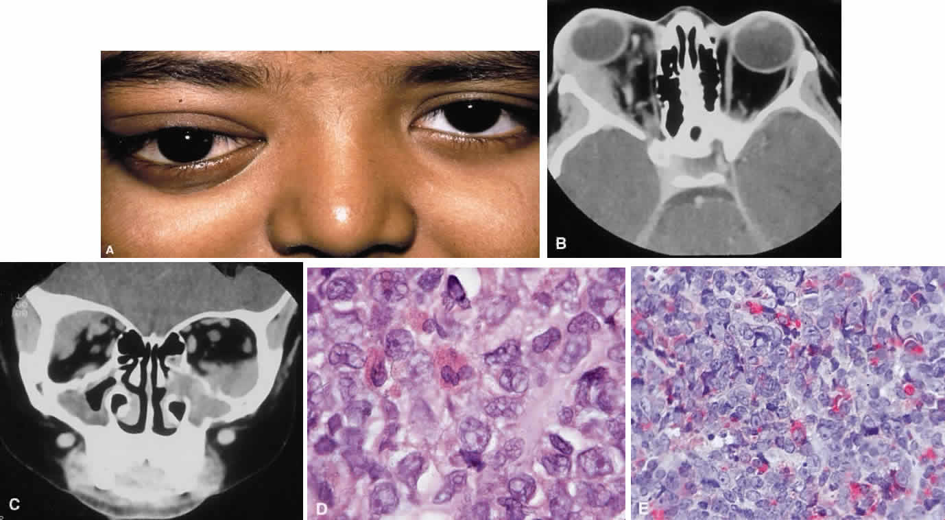ORBITAL LEUKEMIA The eyes and adnexa are sites of metastasis in 80% of systemic leukemias.155–158 The acute myelogenous leukemias are more likely to involve the orbit than chronic or lymphocytic leukemia159–160 (Fig. 23). Bilateral proptosis caused by leukemic infiltration is seen in approximately 2% of cases and may present with intralesional hemorrhage in the case of granulocytic leukemia.161–163 Differential diagnosis of rapid-onset proptosis with hemorrhage in the pediatric population also includes rhabdomyosarcoma, metastatic neuroblastoma, Ewing's sarcoma, orbital cellulitis, and cavernous sinus thrombosis. Although rare in children, orbital lymphoma also must be excluded. GRANULOCYTIC SARCOMA Granulocytic sarcoma, also known as chloroma, is an isolated tumor consisting of myeloid leukemic cells in the soft tissue or bone of the orbit in the absence of peripheral blood or bone marrow involvement164 (Fig. 24). In a series of 33 patients, chloroma occurred at a mean age of 7 years with a male-to-female preponderance of 3:2 and was more common in Africans and Asians.165 Early diagnosis is critical because treatment with chemotherapy can stave off the acute myelogenous leukemia, which can rapidly follow with bone marrow disease appearing in 2 months and death as early as 3 to 12 months, despite chemotherapy.166–168 It has been called chloroma because of the myeloperoxidase activity of the leukemia, which stains the tumor green (Fig. 25).
