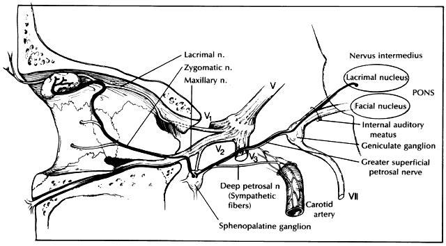 and then gradually decreases over a lifetime.5,6 The main lacrimal gland is a bilobed, flat, oval mass of approximately 78 g. It occupies the space between the globe and orbital roof in the superior temporal quadrant of the orbit.7 The lobulated, grayish pink surface of the lacrimal gland allows one to easily distinguish this gland from surrounding orbital tissue. In addition, a thin pseudocapsule covers the gland, which assists in surgically defining a tissue plane between some lacrimal gland neoplasms and normal orbital tissue.8,9 The inferior surface of the lacrimal gland contours to the shape of the globe and is therefore slightly concave. The superior convex surface fills a shallow depression in the anterior lateral aspect of the frontal bone called the fossa glandulae lacrimalis, or lacrimal gland fossa. The lacrimal gland fossa may be seen on plain radiographs as a smooth line arching over the superior temporal orbital rim. The lacrimal gland is divided into two lobes by the lateral edge of the levator palpebrae aponeurosis. The orbital lobe, which is situated in a posterosuperior position, is two to three times larger than the palpebral lobe, which is situated in an anteroinferior position. The posterior edge of the orbital lobe is in the approximate coronal plane of the posterior pole of the globe. The anterior margin of the orbital portion rests on the superior surface of the levator palpebrae aponeurosis and is covered by orbital septum, orbicularis oculi muscle, and skin. The medial edge of the orbital lobe is situated within the preaponeurotic fat pocket anteriorly and approximates the lateral margin of the superior rectus muscle posteriorly. The lateral edge of the orbital lobe extends inferiorly toward the superior margin of the lateral rectus muscle.10 The palpebral lobe is located under the levator aponeurosis and just above the superior lateral conjunctival fornix. It is this portion of the lacrimal gland that is often visible when the upper eyelid is everted. The lacrimal gland is supported by four fascial structures, including Soemmering's ligaments, Whitnall's ligament, the inferior ligament of Schwalbe, and the lateral horn of the levator palpebrae aponeurosis.11 The majority of fibers that make up Whitnall's ligament pass under and through the orbital lobe to insert on the orbital roof, providing the greatest support for the lacrimal gland.12 The superior surface of the lacrimal gland is weakly adherent to the periosteum of the lacrimal gland fossa by fine trabecular ligaments known as Soemmering's ligaments. The lateral edge of the levator aponeurosis provides additional support as it divides the gland into two lobes. The inferior ligament of Schwalbe is a small band of fascia, associated with the lacrimal artery and nerve, that passes under the posterior lip of the lacrimal gland. The anterior margin of this ligament and the lateral margin of the levator aponeurosis define an oval opening referred to as the lacrimal foramen.11 It is through this foramen that ductules of the orbital lobe pass into the palpebral lobe. These ductules intertwine with ductules of the palpebral lobe and penetrate the conjunctiva of the lateral superior fornix, approximately 4 to 5 mm above the superior tarsal margin. Innervation of the lacrimal gland is quite complex (Fig. 1). Parasympathetic motor fibers originate from the lacrimal nucleus in the pons. From the nucleus, fibers exit the pons in the ventrolateral aspect of the cerebellopontine angle as the nervus intermedius. This fine nerve runs between the motor root of the seventh and eighth cranial nerves as they enter the internal auditory meatus. The fibers continue through the geniculate ganglion without synapsing and then course away from the seventh cranial nerve. Once the fibers leave the geniculate ganglion they are referred to as the greater superficial petrosal nerve. This nerve runs in a groove in front of the petrous temporal bone. Under the gasserian ganglion it joins the deep petrosal nerve (which consists of sympathetic fibers from the internal carotid plexus) and forms the vidian nerve in the cartilage over the foramen lacerum. The vidian nerve passes through the pterygoid canal to synapse in a ganglion within the pterygopalatine fossa known as the sphenopalatine ganglion, Meckel's ganglion, or pterygopalatine ganglion. The ganglion is attached to the maxillary nerve by several short pterygopalatine nerves that carry the postsynaptic parasympathetic lacrimal fibers. These fibers then enter the orbit via the zygomatic nerve. A branch from the zygomatic nerve leaves the infraorbital groove to join the lacrimal nerve, a branch of the first division of the trigeminal nerve. The lacrimal nerve bifurcates as it enters the posterior edge of the lacrimal gland. The branch containing fibers to the lacrimal gland penetrates to the hilus of the gland and then passes peripherally with the ductules to innervate individual lobules of acini. The other branch of the bifurcation passes forward to provide innervation to the upper eyelid and superior conjunctival fornix. Sympathetic innervation is known to reach the lacrimal gland via the vidian nerve, described above, as well as via the ophthalmic artery and lacrimal artery. The role of sympathetic innervation in the control of lacrimal secretion remains uncertain. The lacrimal gland receives its blood supply from the internal and external carotid system. The majority of blood is provided by the internal carotid system via the lacrimal artery, a branch of the ophthalmic artery. The lacrimal artery anastomoses with branches of the external carotid system at a minimum of two sites. The first anastomosis is at the distal tip of the superior orbital fissure with the anterior division of the middle meningeal artery. The second anastomosis is within the eyelids between the anterior deep temporal artery and the lacrimal artery. Occasionally, the infraorbital artery sends a branch to the lacri