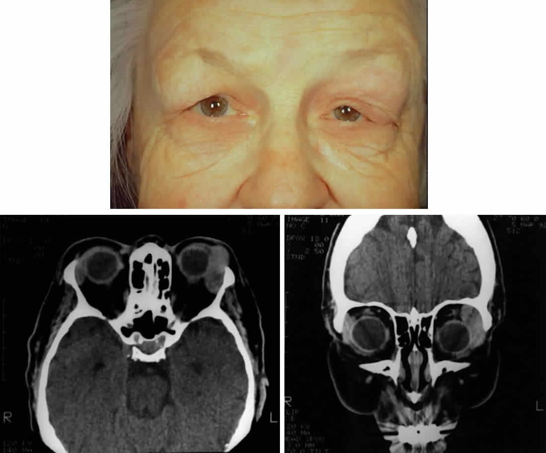 and tender. Often, mechanical ptosis and periorbital edema with erythema, conjunctival