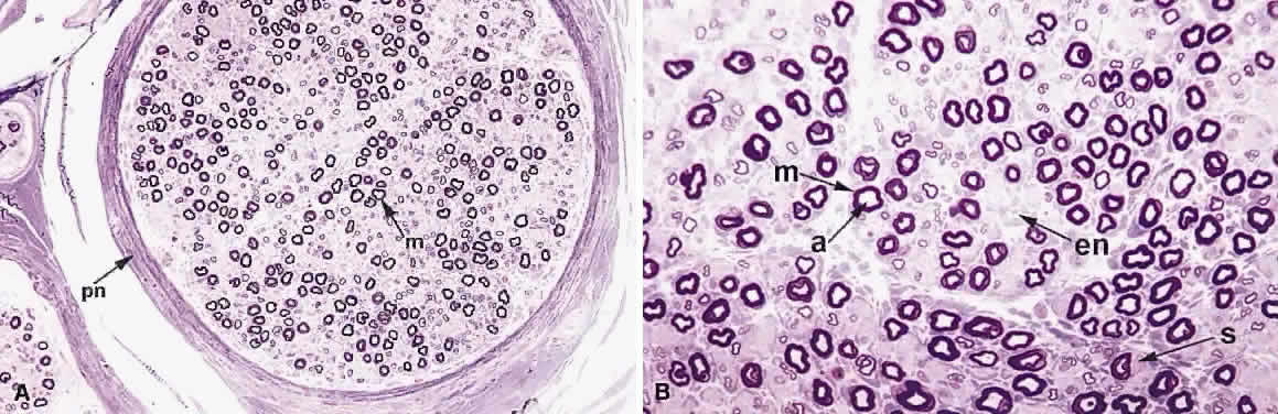 tumor. To better understand the composition of neurogenic tumors of the orbit, we first must understand the basic histologic composition of a peripheral nerve. A peripheral nerve is composed of several bundles of axons referred to as fascicles. Within the peripheral nervous system, an axon is considered to be an extension of an individual nerve cell body. Each axon is invested with Schwann cells that provide the myelination for each individual axon of a fascicle. Between these individual longitudinally oriented axons is the endoneurium. The endoneurium is composed of amorphous extracellular matrix material and collagen fibrils, which provide the infrastructure for the support of the axons. The perineurium is the connective tissue that surrounds each fascicle (Fig. 1). The epineurium encompasses the entire nerve and contains the blood supply of the nerve.