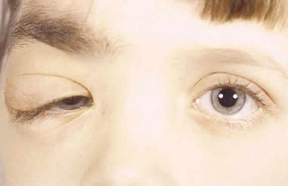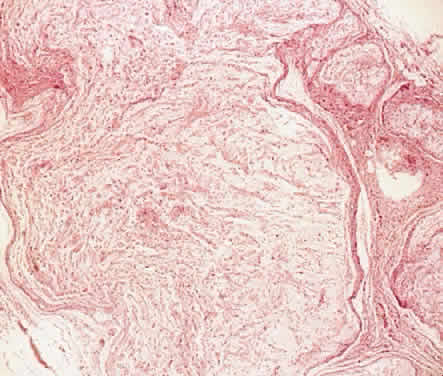 The plexiform neurofibroma is the most common orbital manifestation of neurofibromatosis type 1. Features of malignancy are uncommon in plexiform neurofibromas, although patients with neurofibromatosis have a greater likelihood of developing a malignant peripheral nerve sheath tumor than individuals in the general population. Plexiform neurofibromas most commonly develop within large peripheral nerves. These tumors tend to distort large segments of nerve, most commonly in the extremities. This diffuse thickening experienced on palpation of these lesions has been referred to as a “bag of worms” (Fig. 5). Elephantiasis neuromatosa occurs when diffuse thickening of the nerve leads to enlargement and distortion of an entire extremity. A similar orbital presentation may be caused when plexiform neurofibroma invades the eyelids and surrounding facial nerves and tissues. Histologically, plexiform neurofibromas have several unique characteristics. Microscopically, they are composed of tortuous branches of expanded nerves that appear disorganized when cut in different planes of section. These tumors often appear to have an increased amount of myxoid extracellular matrix material, which produces the characteristic histologic appearance of the tumor (Fig. 6). Special stains, such as silver stains, often can be used to identify axons within these lesions. Neurofibromas, as opposed to Schwannomas, often invade the nerves, and entrapped axons can be identified with these staining methods. The major differentiating feature between the diffuse neurofibroma and the plexiform neurofibroma, however, is the clinical appearance. The plexiform neurofibroma causes a diffuse enlargement and distortion of the nerve and a characteristic eyelid deformity (Fig. 7).