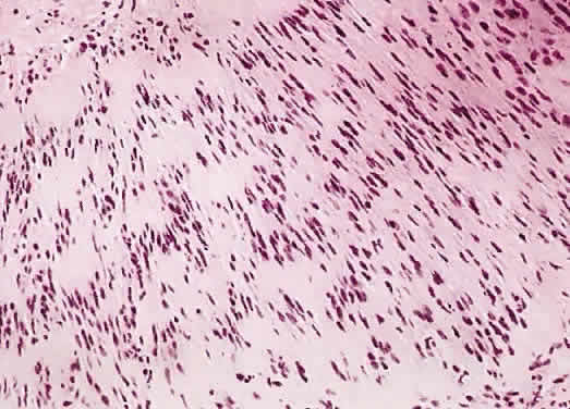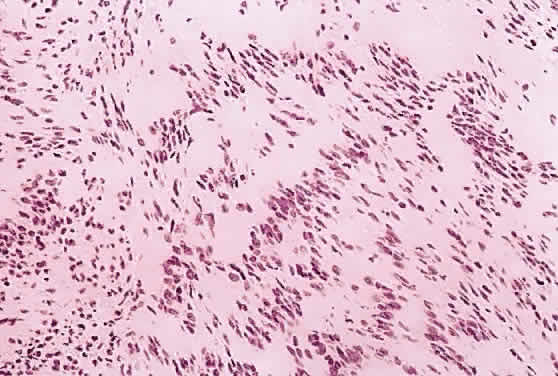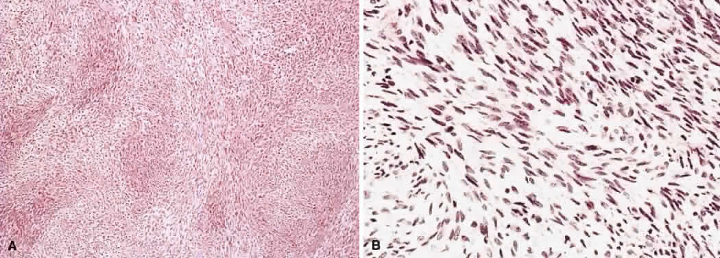 tumor. MPNSTs may arise de novo or within the setting of neurofibromatosis. It has been reported that MPNST develops in 2% to 29% of patients with neurofibromatosis type 1.7 In general, approximately half of MPNSTs occur within neurofibromatosis and half arise de novo. These tumors most commonly occur in the large nerve trunks of the body, including the brachial plexus, the lumbar plexus, and the sciatic plexus. They therefore tend to occur around the spinal cord and often extend into the extremities. They often can extend far beyond the grossly defined tumor margins, and the performance of frozen sections to delineate surgical margins at the time of surgery is prudent if an MPNST is suspected. When arising in the orbit, they have a propensity to occur in the anterior supranasal orbit, arising from the supraorbital branch of the trigeminal nerve. Jakobiec and associates8 reported a series of eight cases of orbital MPNST. All tumors in this series arose from a supraorbital branch of the trigeminal nerve. Clinically, all eight patients in this series had masses in the superior nasal aspect of the orbit immediately beneath the lid. A striking and worrisome feature of orbital MPNST is the frequent innocuous clinical appearance of the tumor at initial presentation.8 For example, despite clear histologic evidence of malignancy, no patient reported erosion of the overlying skin and in no patient was the malignant nature of the lesion suspected clinically. There was no gender predilection, and the right orbit was affected as commonly as the left orbit. Two of eight patients had neurofibromatosis in Jakobiec's study and five of eight patients died 1 to 5 years after resection of the tumor. Recurrent tumors tended to occur within 6 months after surgery. MPNSTs have been noted to extend long distances along nerves, and intracranial spread to the middle cranial fossa was reported in some patients. The histopathologic appearance of MPNSTs is variable, and heterologous elements have been reported frequently. Classically, the tumor is markedly hypercellular, forming interlacing fascicles of tumor cells (Fig. 12). Mitotic figures often are conspicuous, although they may be represented variably within individual tumors. Often, densely cellular fascicles of tumor cells alternate with less densely cellular or hypocellular areas. In extraorbital locations, heterologous elements, such as elements of rhabdomyoblastic differentiation, may occur in up to 10% of tumors. MPNSTs containing zones of rhabdomyoblastic differentiation or triton tumors have not been reported in the orbit. Areas of cartilage, bone, and zones of glandular differentiation have been reported in extraorbital MPNSTs. MPNSTs are not particularly responsive to chemotherapy or radiation therapy; thus, surgical excision is the major treatment modality available. Large tumor size and the presence of necrosis have been associated with an aggressive clinical course.9 Because orbital occurrence is rare, it is not known whether the same prognostic indicators of MPNSTs elsewhere in the body are applicable to orbital MPNSTs. |