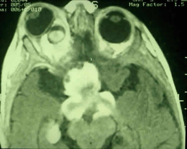 Globular tumors in the suprasellar area that lack these features usually require craniotomy and biopsy confirmation. Lesions that may be difficult to distinguish from optic pathway gliomas include germinomas of the visual system and optic nerve choristoma because they both may appear intrinsic to the visual pathway.13 Tumors such as craniopharyngiomas and pituitary adenomas usually do not appear intrinsic to the visual pathway and may have features of sellar enlargement. Findings such as enhancement of the leptomeninges or peripheral enhancement of an enlarged chiasm are atypical of optic glioma and may indicate an inflammatory process masquerading as a glioma.83 Aneurysms in the suprasellar area may sometimes appear on neuroimaging to be intrinsic to the visual pathway. Better definition may be noted with magnetic resonance angiography.13 In contrast to orbital optic nerve gliomas, meningiomas enhance strongly with gadolinium and are less common in children. Meningiomas have the following features on axial CT scanning that are not typically shared by optic nerve gliomas: