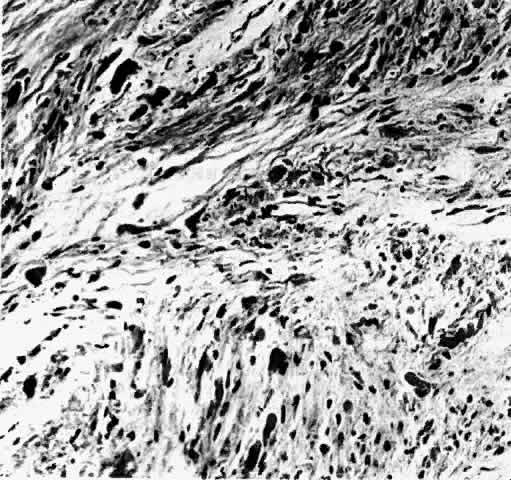 The histopathologic features of a chiasmal glioma are almost identical to those of an optic nerve glioma. Because the normal optic chiasm lacks the connective tissue septae found in the normal optic nerve, these septae are not found in chiasmal glioma specimens.71 A reactive leptomeningeal hyperplasia may surround gliomas, leading to an erroneous biopsy interpretation of meningioma23 (Fig. 9). In contrast to schwannomas and neurofibromas, which are positive for the intermediate filament vimentin, immunohistochemical analysis of cytoplasmic glial intermediate filaments in pilocytic astrocytomas reveals positive staining for glial fibrillary acidic protein.87 Electron microscopy demonstrates that the major cell type of optic gliomas is the astrocyte. Glial filaments measuring 500 to 1000 nanometers in diameter are packed into the cell processes. These may merge together into irregular masses (Rosenthal fibers) containing alpha-B-crystallin.88,89 Astrocytes form basement membrane material only where they abut on connective tissue spaces.4 Optic nerve enlargement by the tumor may be secondary to many factors, including (1) a proliferation of neoplastic astrocytes, (2) an accumulation of extracellular mucosubstance secreted by the astrocytes in cystic spaces, and (3) a reactive proliferation of arachnoidal tissue.69 Two distinct growth patterns in pilocytic astrocytomas have been described. The expansile-intraneural pattern includes thickening of the nerve parenchyma with minimal growth of the tumor into the arachnoid and minimal reactive proliferation. The second type has features of circumferential-perineural growth, involving tumor eruption and proliferation into the subarachnoid space. As mentioned in the section on imaging, the latter pattern may be more suggestive of NF-1-related gliomas.60,69 Although optic gliomas may demonstrate rapid growth despite treatment, other tumors may remain quiescent for years. Although uncommon, spontaneous regression has been reported.90 Controversy exists as to whether optic gliomas are hamartomas or true neoplasms. The tumors were first described as hamartomas by Hudson in91 In 1969, Hoyt and Baghdassarian92 supported Hudson's theory and concluded that optic gliomas represented congenital, non-neoplastic tumors with self-limited growth followed by stability. Histologic features and growth rates, however, suggest that optic gliomas are true neoplasms. Burnstine93 evaluated optic gliomas with colloid silver impregnation of nucleolar organizer region-associated proteins (AgNORs) whose size, number, and morphology indicate the pattern of cell proliferation or transformation. Optic glioma AgNOR counts were similar to optic nerve meningiomas and had features consistent with true neoplasms (Fig. 10). In a review of 623 reported cases, Alvord and Lofton2 described optic nerve growth kinetics based on time to recurrence of disease. Growth patterns had variable rates, ranging along a continuum from a simple logarithmic rate to a decelerating growth rate; these rates were not characteristic of hamartomas. Aggressive clinical tumor behavior, noted either by local tissue invasion or by remote seeding, has been described in optic glioma patients. Florid invasion of the leptomeninges by some NF-1-associated optic gliomas has been seen.60 Lourie and colleagues35 reported that in five of seven patients, extension of the tumor into the lateral geniculate bodies and optic radiations had occurred. They concluded that this synapse site in the visual pathway was not a barrier to tumor spread. de Keizer and co-workers94 reported on a 3-year-old child with NF-1 who had an optic glioma with intraocular extension and subsequent malignant degeneration within the glial tissue. Both lumbar spinal metastases from optic pathway gliomas95–97 and malignant ascites from spreading of glioma cells through a ventriculoperitoneal shunt98 have been described. |