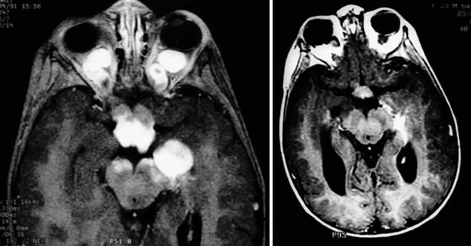 As a consequence of asymmetric or unilateral visual loss, sensory-induced strabismus may develop.18,28 Gliomas interfere with ocular motility by causing direct mechanical restriction4 and paralytic strabismus. Damage to the ocular motor nerves may occur directly by invasion of the tumor at the orbital apex, or secondarily by raising intracranial pressure. Vertical, horizontal, rotary, and see-saw nystagmus has been reported, and may even precede visual loss as an initial sign of a glioma. Consequently, children with spasmus nutans or monocular or asymmetric nystagmus may need neuroimaging and careful follow-up in order to exclude a chiasmal glioma.43–47 Patients with chiasmatic and hypothalamic involvement may develop endocrinologic manifestations, including diabetes insipidus, panhypopituitarism, girdle-type obesity, and dwarfism.48 If hypothalamopituitary function is impaired, children may exhibit a precocious puberty in association with growth hormone deficiency.49,50 Depending on the extent of the glioma in the hypothalamic region, neurologic manifestations can include epilepsy, hemiparesis, and the diencephalic syndrome. With obstruction of the third ventricle or foramen of Monro, hydrocephalus may occur with manifestations of lethargy, headache, and vomiting. |