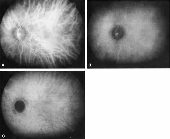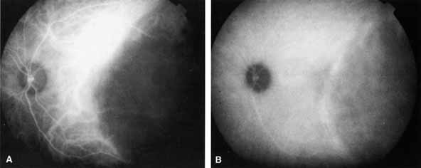 time. As expected, the different patterns of fluorescence of these tumors appear to reflect their different choroidal vascular architecture with only minimal or no leakage of the ICG dye. Choroidal hemangiomas consistently exhibit a relatively unique fluorescence pattern, and ICGA may be a helpful test in differentiating these lesions from potentially simulating tumors, such as amelanotic choroidal melanomas and choroidal metastases.87 How ICGA compares with other diagnostic tests, such as FA and ultrasonography, in terms of sensitivity and specificity in this area is not known. Further investigation is needed to better assess its clinical utility in this area. |