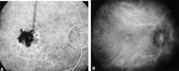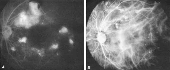 | In general, the most promising clinical application of ICGA is as an adjunct to FA in the diagnosis and management of exudative age-related macular degeneration (AMD).2–4,11,12,13 ICGA may also be of value in evaluating other choroidal-based pathologic processes, such as choroidal tumors, central serous chorioretinopathy, and choroidal inflammatory or degenerative diseases.9 ICGA has been used in various ways to study choroidal vascular flow, and the technique, in general, may be helpful in elucidating the pathophysiology of diseases involving the choroidal vasculature.8,37,39–43 |