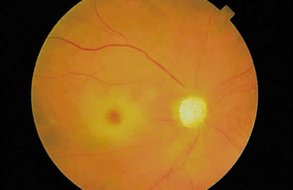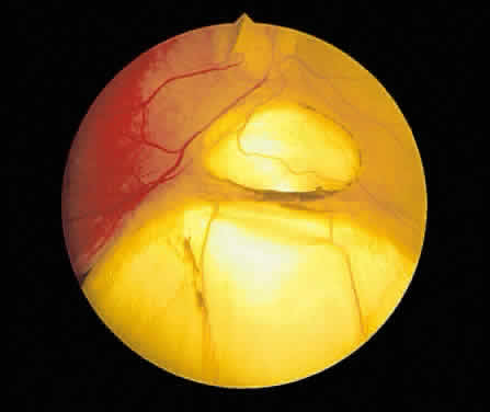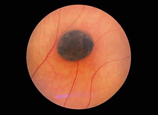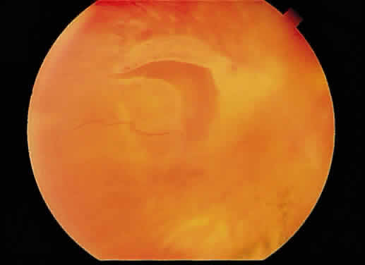 and choroid, together with the choroidal blood flow. Consider the variation in pigmentation and choroidal blood flow. In one extreme, the albino, the fundus has a bright orange color because the pigment epithelium contributes little to fundus color in this condition. At the opposite extreme is the patient with congenital melanosis oculi such as seen with nevus of Ota. In this condition, the density of normal choroidal melanocytes masks much of the orange color of the choroid and changes the general fundus color to a gray-orange. If the choroid and pigment epithelium were absent focally, the observer would be looking through transparent retinal tissue at the sclera, which is white. This is the basis for the ophthalmoscopic appearance of a coloboma (Fig. 1). With the exception of the macula, in which xanthophyll pigment may impart a yellow color, the normal neurosensory retina is transparent. Despite this transparency, when the retina is focally absent, the orange color of the underlying choroid is enhanced. This color contrast may aid the ophthalmoscopic detection of retinal breaks (Fig. 2). Nevertheless, remember that the normal retina does not contribute color to the fundus. In fact, a loss of retinal transparency or the acquisition of color by neurosensory retinal tissue is indicative of a pathologic change.