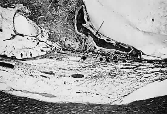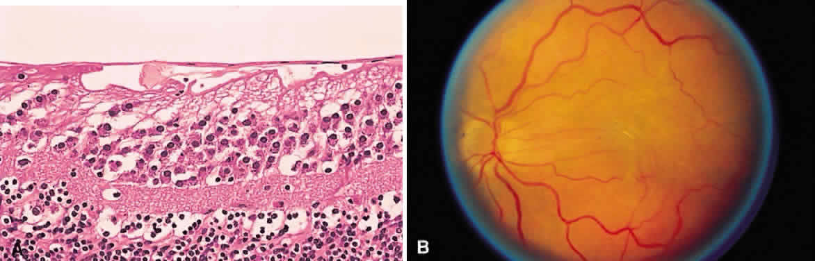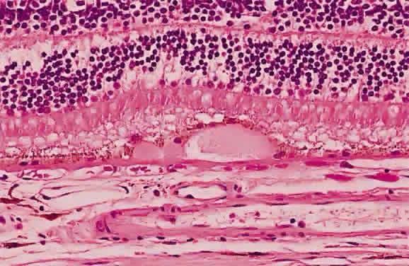 Notice that in the fovea, the obliquely oriented outer plexiform layer lies superficially, since the ganglion cell layer and nerve fiber layer are centrifugally displaced in this region. Therefore, typical nerve fiber layer hemorrhages (flame-shaped hemorrhages) are not seen in the fovea. The modifications of the retinal cytoarchitecture in the macula also affect the appearance of exudates and early retinal necrosis in this region. |