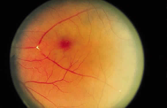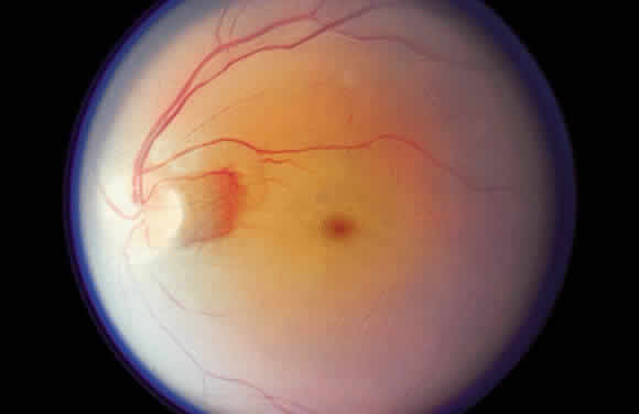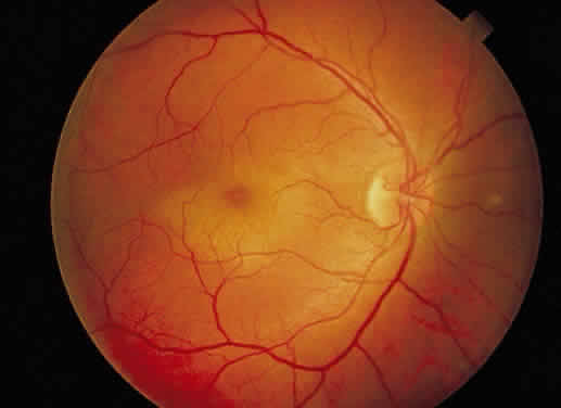 Reflection from the surface of the retina during ophthalmoscopy is attributable to the presence of a normal internal limiting membrane, a true basement membrane, secreted by the Müller cells. Loss of this reflection may indicate pathologic changes at the level of this structure (Fig. 3), such as a preretinal membrane (see Fig. 3). The color of normal retinal blood vessels depends on the composition of the blood column and the transparency of the blood vessel wall. The color of the normal vessels is altered in states of poor oxygenation (pulmonary diseases), extremely elevated lipid levels (lipemia retinalis) (Fig. 4), or opacification of the blood vessel wall, as seen in arteriolosclerosis (Figs. 5 and 6).