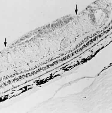 Notice that all of the examples of hypertrophy of the retinal pigment epithelium cited earlier refer to conditions present at birth. Since the retinal pigment epithelial cells are dopa-negative postnatally, it is doubtful that they synthesize additional pigment in adulthood.17 When injury induces pigment epithelial hyperplasia, tight adhesions may be formed between this layer and the neurosensory retina. The black demarcation lines seen in detachments of the neurosensory retina is an example of this type of pigment epithelial response (Fig. 49). The seal thus created tends not be as tight as one created therapeutically when performing retinopexy, and the detachment is more likely to advance beyond the demarcation line.