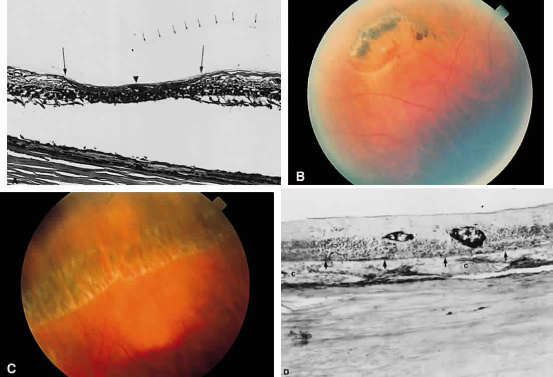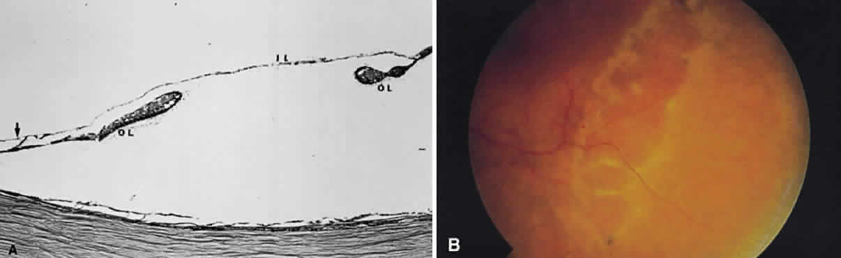 of nerve fiber layer infarcts and hemorrhages in the periphery. Among the ophthalmoscopically observed conditions peculiar to the retinal periphery are the phenomena of “white-with-pressure” and “whitewithout-pressure.”22 White-with-pressure may be observed in the retinal periphery during scleral depression. The retina overlying the scleral indentation transiently opacifies; this opacification resolves when the external pressure on the scleral is released. The pathophysiologic explanation for the phenomenon of white-with-pressure is not clear. On the other hand, white-without-pressure does have a pathophysiologic explanation. In white-without-pressure, the retina also appears to be opacified, but the opacification is unrelated to external pressure on the scleral. White-without-pressure may have poorly defined or sharp borders, delineating the posterior edge of the vitreous base. It is seen commonly in elderly patients, adjacent to the ora serrata, and most commonly in darkly pigmented patients and in Asians, especially those who are myopic. Three distinctive retinal degenerations occur frequently in the periphery: peripheral cystoid degeneration, lattice degeneration, and paving stone degeneration. Typical cystoid degeneration involves the formation of cyst-like spaces at the level of the outer plexiform layer (Blessig-Iwanoff cysts) (Fig. 59). These are common lesions, present in most persons from the first decade of life. These “cysts” appear to become more numerous with age. Coalescence of these cysts may result in “senile” retinoschisis.23 Reticular cystoid degeneration involves a disruption at the level of the nerve fiber layer. It is located frequently just posterior to the area of typical cystoid degeneration. A network of fine, branching blood vessels is seen commonly over the surface of reticular cystoid degeneration. Degenerative or senile retinoschisis involves a splitting of the retina at the level of the outer plexiform layer for a distance of at least one disc diameter. As seen ophthalmoscopically, degenerative retinoschisis frequently has a “beaten metal” appearance, and fine, white dots may be seen within the cavity. These dots are thought to represent columns of Müller cells that have been stretched to the point of rupture: the clinically observed dots are Müller cell remnants that remain adherent to the internal limiting membrane. These Müller columns are believed to be responsible for the unevenness of the outer schisis surface; the inner surface is typically smooth. Large holes in the outer wall of the schisis cavity (by convention, “outer” refers to the scleral side of a retinal lesion whereas “inner” refers to the vitreous side of the retina) are frequently observed (Fig. 60), although smaller inner layer holes are less common. The presence of holes in both the inner and outer walls of a schisis cavity creates a pathway from the vitreous to the subretinal space, and a rhegmatogenous retinal detachment may develop. In retinal lattice degeneration, there is thinning of the inner retinal layers with loss of the internal limiting membrane. These changes are associated with liquefaction of the overlying vitreous. In addition, strong vitreoretinal adhesions are present at the edges of the lattice lesion (Fig. 61A). These adhesions are important because in the event of a posterior vitreous detachment, traction on the posterior edge of the lattice lesion may result in a tear (see Fig. 61B). The fluid behind the detached vitreous may gain access to the subretinal space through the retinal break and lead to separation of the neurosensory retina from the pigment epithelium, the process known as retinal detachment. Atrophic retinal holes may appear in the thinned zone of retina, but these small asymptomatic holes do not carry the same ominous prognostic implications for retinal detachment as the retinal tears. Ophthalmoscopically, retinal lattice degeneration appears as punched-out lesions located between the ora serrata and the equator. The lesions may be oriented either equatorially or radially and may be pigmented (so-called “pigmented lattice”) (see Fig. 61C). The name is derived from the presence of white lines criss-crossing within the thinned retina (see Fig. 61D). The lines seen clinically are blood vessels with hyalinized walls. The vessels are patent, an observation that can be confirmed clinically by fluorescein angiography. These lines, however, are not present in every case, so that clinical recognition of retinal lattice degeneration often is based on the clinical context of retinal thinning and geographic location. In contrast to lattice degeneration, which affects the inner retinal layers, paving stone degeneration (cobblestone degeneration, peripheral chorioretinal degeneration) affects the outer retinal layers.24 Ophthalmoscopically, paving stone lesions appear as well-demarcated concave zones of depigmentation (Fig. 62A and B). Frequently, the depigmentation is so marked that the larger, outermost choroidal vessels may be seen running through the lesion. The lesions usually are located just posterior to the ora serrata. These depigmented zones may appear individually or may coalesce into larger lesions that demonstrate a scalloped border with pigmented edges. Histologically, there is loss of the outer retinal layers, including the retinal pigment epithelium (see Fig. 62C). The loss of pigment epithelium accounts for the color of the lesion and permits the larger choroidal vessels to be viewed ophthalmoscopically. The thinned neurosensory retina is firmly adherent to underlying Bruch's membrane and to the reactive pigment epithelium at the margins of the lesion. The pigment epithelial changes account for the clinically observed black border of these zones. Unlike retinal lattice degeneration, there is no change in the overlying vitreous and no pathogenic relation to retinal detachment. In fact, the histopathologic appearance 