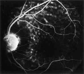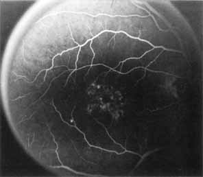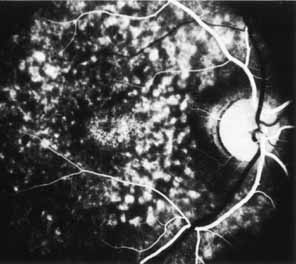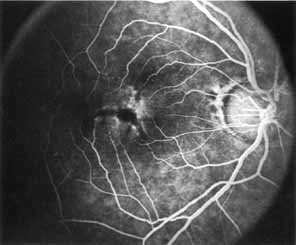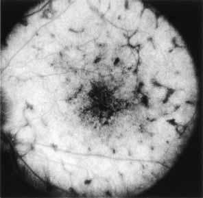 In the early stages of the dystrophy, the optic disc, retinal vessels, and peripheral retina are usually normal. The patient may have a visual acuity of 20/200 and normal color vision by standard testing and, yet, generalized cone dysfunction can be demonstrated by color field testing. In the late stages, there may be temporal optic disc pallor, attenuation of the retinal arterioles, and granular or bone spicule peripheral retinal pigmentary changes. Not infrequently, the peripheral pigmentary abnormalities may be regional. This probably reflects regional rod involvement, as evidenced by ERG, which may demonstrate a reduction in amplitude without a change in latency of the rod responses.72,80 At this stage, contracted peripheral fields may be found on both white and color target testing. No medical treatment is available. The prognosis for vision is guarded and poorer than for the other cone dystrophies because both cone and rod function is impaired in the macula and retinal periphery. Accordingly, central vision is decreased and color vision impaired in association with contraction of the peripheral visual fields. As the dystrophy progresses, vision may decrease to the 20/400 level or less and may also be accompanied by contracted peripheral fields and a total color defect. Patients with poor central vision should be referred to low visual aids. Severe photophobia in adults and children has been reduced with the use of appropriately tinted spectacles or contacts. The tint will often depend on the dystrophy as some patients with relatively well-preserved color vision require neutral tints and other more severely affected patients require red tints similar to those in rod monochromats. Miotic drops have been used in some patients with severe photophobia but are not generally well tolerated or advised. Ancillary Tests Fluorescein angiography demonstrates increased transmission of choroidal fluorescence in the macula during early phases of the study, without late leakage of dye or fluorescein staining. In addition, an annular pattern of hyperfluorescence is often seen in the macula, highlighting the bull's-eye pattern seen on fundus examination (Fig. 4). Visual field defects include central scotoma, peripheral field loss, and ring scotoma.