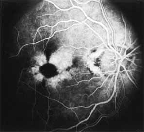 Ancillary Tests Fluorescein angiography demonstrates an ovoid area of hyperfluorescence and late staining corresponding to the RPE defect surrounding a central hypofluorescent spot related to the grayish yellow deposition material (Fig. 30). The posterior pole flecks seen in the type 2 lesions may demonstrate some hyperfluorescence and, possibly, late staining (Fig. 31).
