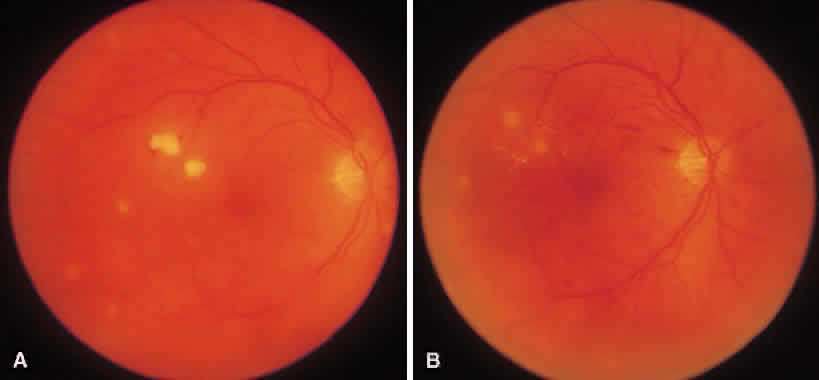 endospores can then give rise to future generations of the organism.234 The saprophytic mold fungus grows well on most routine culture media at room temperature. Definitive identification requires documenting the production of spherules at 40°C in liquid culture or in experimentally infected animals.234 The infection results from inhalation of arthroconidia. The arthroconidia are easily detached from the hyphae and released into the atmosphere. The organism is commonly found in dust. For this reason, agricultural and construction workers are particularly prone to infection. C. immitis is one of the most virulent of all fungi, and inhalation of only a few conidia in an immunocompetent host will produce infection. After exposure of the organism to the respiratory tract, the infection may result in a subclinical pneumonitis or mild to severe respiratory disease. In the immunocompetent person, it is usually self-limited and resolves in 2 to 3 weeks without significant sequelae. In unusual cases it can lead to chronic pulmonary disease and pulmonary scarring. Disseminated infection may occur in immunosuppressed patients, including AIDS patients and patients receiving steroids. The disseminated infection may result in a chronic cutaneous disease, a widespread lymphatic disease, bone involvement, visceral organ involvement, or meningitis.235–237 Coccidioidomycosis is highly endemic in the southwestern United States, northern Mexico, Central America, and several South American countries. The San Joaquin Valley is the most endemic area in the world. Since 1990, there has been a dramatic increase in cases of coccidioidomycosis documented in California. This recent increase in reported cases was related to cycles of severe aridity followed by intense rainfall. In addition, increases in construction with associated soil turnover in the area may have played a factor.238,239 DIAGNOSIS Culture of the organism from body tissues or direct identification histopathologically is the only way to make a definitive diagnosis. In addition, a skin test using extract from the saprophytic phase of the fungus may be helpful. Serologic tests, including the tube precipitin test, latex agglutination test, immunodiffusion test, and complement fixation test, may be used.234,237,240–242 OCULAR MANIFESTATIONS The first histologically proven case of endophthalmitis secondary to C. immitis was reported in 1948.243 Since then, several culture-positive and histopathologically proven cases have been reported.244–260 A prospective study found that 50% of patients with chronic pulmonary or disseminated coccidioidomycosis had ocular involvement.254 Because of this high incidence of ocular involvement, any patient with chronic pulmonary or systemic coccidioidomycosis should have a screening ocular examination. The ocular involvement can range from lid lesions to panophthalmitis. The anterior segment involvement may be extraocular and include conjunctivitis, episcleritis, scleritis, or keratoconjunctivitis. Intraocular involvement may range from a chronic granulomatous iridocyclitis to a fulminant acute anterior segment inflammatory response. Posterior segment involvement includes vitritis, choroiditis, and retinitis. There is a predilection for the peripapillary choroid to be involved, and patients may have peripheral punched-out scars similar to those seen in ocular histoplasmosis. Active choroidal lesions are often white and elevated and may involve the overlying retina. Subretinal fluid and exudate may be present. Scars may be seen in asymptomatic patients with a prior history of systemic coccidioidomycosis. In one study, 5 of 54 patients with documented systemic coccidioidomycosis had inactive peripheral chorioretinal scars.257 TREATMENT There is limited information regarding the treatment of ocular C. immitis infection.258–260 The organism usually responds to amphotericin B, although failures have occurred, both in the treatment of systemic infection and ocular infection.234,237,258–260 Intravenous miconazole has been used in cases of systemic coccidioidomycosis with ocular involvement, but the recurrence rate is high, and in one case the chorioretinitis developed while the patient was receiving the drug; in this case the infection subsequently responded to intravenous amphotericin B.255 Ketoconazole has been used in the treatment of systemic infection, but recurrence rates as high as 25% have been reported.261,262 In one study of 112 patients with nonmeningeal coccidioidomycosis, a success rate of 23% was obtained using 400 mg ketoconazole daily and 32% using 800 mg daily.262 Fluconazole and itraconazole appear to be effective for systemic coccidioidomycosis; however, their efficacy for ocular involvement is unproven.263,264 It is important to maintain a high index of suspicion for C. immitis infection in any patient with ocular inflammation of unknown etiology living in or traveling to an endemic area. This is particularly true for patients who have previous exposure to the organism. Ocular involvement has been reported as late as 22 years after primary systemic infection.258 |