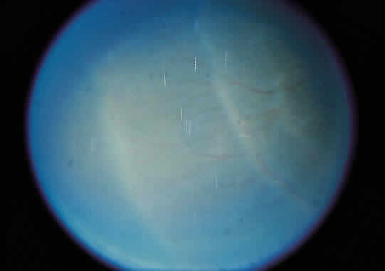 In a study of 19 infants who were randomly assigned to immediate laser or observation until threshold disease was reached, the unfavorable anatomic outcome rate was 16% for early treatment eyes and 18% for control eyes.75 Eighty-eight percent of control eyes reached threshold disease. There does not seem to be a clear-cut advantage to early treatment of posterior ROP so long as prompt treatment at threshold disease can be assured. Good visual results are more likely to occur after laser for threshold ROP than after cryotherapy.76,77 At an average follow-up point of 5.8 years, Connolly and colleagues report a 6.91 times greater chance that an eye treated with laser will have visual acuity of 20/50 or better when compared with its fellow eye treated with cryotherapy.76 Similarly, there is a lesser degree of myopic refractive error in infants treated with laser.76, 77, 78, 79, 80 Laser photocoagulation can be delivered in the ICN. We usually perform the procedure under topical anesthesia with sedation. Fentanyl citrate is an ideal agent. The neonatologist calculates the appropriate dose, and continuous cardiopulmonary monitoring is done with a nurse constantly in attendance at the bedside. As when using cryotherapy, pupils can be dilated with one drop of homatropine hydrobromide 2% and phenylephrine hydrochloride 2.5% given every 15 minutes for three doses starting 1 hour before the treatment. A lid speculum is inserted into the conjunctival cul de sac. Assisting personnel and other personnel in the treatment area of the nursery should wear appropriate protective eye wear. Using a scleral depressor to rotate the eye, the peripheral retina is brought into view through the laser indirect ophthalmoscope, and laser applications are applied throughout the anterior avascular zone for 360 degrees. The portable diode laser units are ideal for this treatment. We generally start with a 200-mW power setting at 0.2 seconds' duration. Critical focus onto the retina is essential to decrease the risk of laser absorption by tissues other than the desired area of treatment, especially when a persistent tunica vasculosa lentis is present (Fig. 12). Power is increased in 50-mW increments to achieve a dull white spot on the retina. Applications are placed approximately one burn width apart. The number of applications depends mainly on the location of the termination of the vascularized retina. Zone I disease often requires over 2000 applications. The average number of applications in mid-zone II disease is approximately 950. If both eyes are at threshold, we generally treat both eyes in one session. Approximately 20 minutes are required to complete laser treatment on one eye.