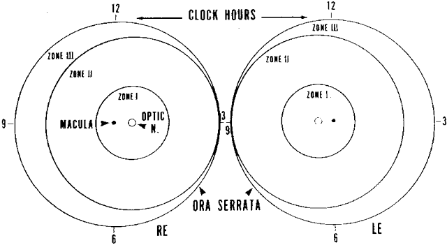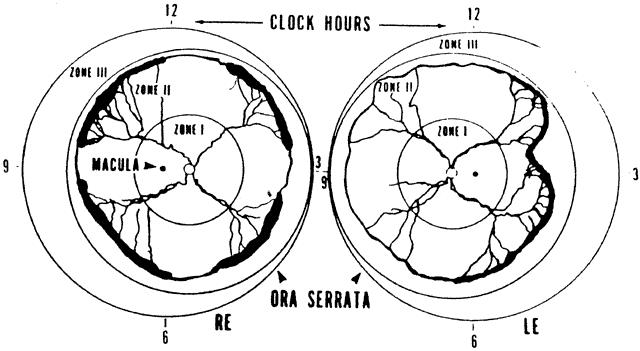 Initially, acceptance of this form of therapy was slow, but it later gained acceptance in the United States.32,53, 54, 55, 56, 57, 58 To resolve any doubt concerning the value of cryotherapy for ROP, the National Eye Institute supported a multicenter prospective randomized clinical investigation called the Multicenter Trial of Cryotherapy for Retinopathy of Prematurity (abbreviated as CRYO-ROP Study). The preliminary results were so favorable that a special expedited publication was released in 1988.59,60 In the CRYO-ROP Study, eligible patients were those who weighed less than 1251 g at birth. Examinations commenced at 4 to 6 weeks of age and were repeated every 2 weeks unless the ROP reached a prethreshold stage: zone I, any stage; zone II, stage 2 (ridge) with plus disease; or zone II, stage 3 (ridge with extraretinal fibrovascular proliferation) less than threshold. Examinations then were repeated at least weekly until progression to threshold disease. Threshold disease was defined as at least five contiguous or eight cumulative 30-degree sectors (clock hours) of stage 3 ROP in zones I or II in the presence of plus disease (Fig. 7). The risk of blindness at threshold was predicted to be 50%. Once threshold disease was reached, the affected eye was randomly assigned to either treatment or observation. If cryotherapy was assigned, then treatment was performed within 72 hours to minimize the risk of progression to stage 4 ROP before treatment could be performed. In the CRYO-ROP Study, the choice of anesthesia was left to the treating physician. When performing cryotherapy, we almost exclusively treated our patients under local anesthesia with infiltration of the subconjunctival space with 0.5% or 1% lidocaine. For cryotherapy, conjunctival incisions rarely are necessary, especially if anterior therapy is performed first, since this softens the globe, allowing for the cryoprobe to be placed further posteriorly. For those still using cryotherapy, the standard retinal cryoprobe was used most often in the study, but a cataract probe and the newer neonatal probes are equally effective. Contiguous single spots of cryotherapy should be applied to the avascular retina anterior to the ridge, but the ridge itself should not be treated because of the possibility of inducing a hemorrhage. The endpoint for the freeze should be sudden whitening of the retina, and the avascular retina should be treated for 360 degrees. The number of applications range from 35 to 50. We now use laser with topical anesthesia in the ICN with monitoring by a neonatologist. Seven days after treatment, the treated eye should be re-examined to assess the effects of treatment. Retreatment is indicated if there are untreated (skip) areas and persistent plus disease in association with either of the following characteristics: segmental shallow retinal detachment (suggesting continued adjacent disease activity) in the areas skipped, or progression of extraretinal fibrovascular proliferation (increasing floridity of the ridge) contiguous with a skipped area. When retreatment is performed, it should be applied only to previously untreated areas in sectors of continued activity. This rarely has been necessary since switching to laser treatment. Preliminary results of the CRYO-ROP Study were based on a 3-month follow-up of eligible infants within the study. The mean birth weight of randomly assigned patients was 800 g, the mean gestational age was 26 weeks, and the mean chronologic age at randomization was 11 weeks. An unfavorable outcome was defined as (1) a retinal fold involving the macula, (2) a retinal detachment involving zone I of the posterior pole, or (3) retrolental tissue or “mass.” There was a 49.3% statistically significant overall reduction in the unfavorable outcome rate at 3 months in the treated versus the untreated eyes (21.8% compared with 43.0%).60 Subsequent reports of the Cryo-ROP Study show persistence of a favorable outcome with treatment. At 1 year, there was a 45.8% reduction in the unfavorable structural outcome rate in eyes of patients randomly assigned to treatment compared with control eyes.61 There was a continued positive effect on structural outcome as a result of treatment as infants were followed at 3½ and 5½ years after randomization.62,63 As children became older and visual acuities could be obtained, there was a similar overall beneficial effect on vision in the treated compared with the control eyes.62,63 However, there were fewer treated eyes than control eyes in the best visual outcome group (20/40 or better) at 5½ years, suggesting a possible adverse effect of cryotherapy on visual acuity or the fact that the untreated eyes never reached as advanced a stage as the treated eyes.63 Ocular complications recorded within the CRYO-ROP Study were not serious, but a 9% incidence of bradycardia or arrhythmia within the study underscores the need for both careful monitoring and performance of the treatment in a facility where resuscitation can be achieved immediately. Greven and Tasman64 report on the occurrence of rhegmatogenous retinal detachment after cryotherapy for ROP that was administered in the manner described in the CRYO-ROP Study. Detachment occurred 1 to 4 years after treatment. Three infants developed rhegmatogenous retinal detachments with breaks located at the posterior edge of cryotherapy. Two of the retinas were reattached with a scleral buckling procedure, but useful vision was regained only in one eye. In the third eye, progression to total inoperable retinal detachment occurred despite scleral buckling. Quinn and associates64a have shown that visual field loss is less than 10% when older children who had cryotherapy are tested. The recommendation of the CRYO-ROP Study was that at least one eye of symmetrical cases at threshold should receive cryotherapy. Surgeons should use their own clinical judgment beyond that recommendation. Our personal recommendation is to treat all ey