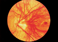 A choriovaginal vein is an uncommonly recognized, unusually large choroidal vessel located within the posterior pole, The choriovaginal vein passes from the choroid through the sclera at the margin of the optic disc to terminate in the venous plexus of the pial sheath of the optic nerve.1 This establishes an indirect communication between the choroidal and retinal venous systems through the pial branches of the central retinal vein.2 It is generally seen temporal to the optic nerve and is predominantly noted in lightly pigmented, myopic fundi1,3 (Fig. 1). This entity was described in a case of trisomy 13 with congenital glaucoma, although it is not typically associated with any systemic abnormalities.4 |