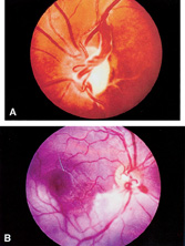 The major complication occurring with prepapillary loops is retinal arterial obstruction within the territory supplied by the loop (see Fig. 3B). This is believed to occur secondary to turbulent flow, endothelial damage, and subsequent thrombus formation.15 Vitreous hemorrhage, amaurosis fugax, hyphema, and retinal venous macrovessel also have been reported.15,17–20 There are no associated systemic abnormalities. Two studies report a familial occurrence of prepapillary loops, although a definite hereditary pattern has not been identified.21,22 |