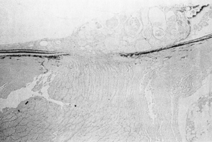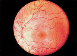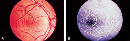Group 1A is composed of unilateral congenital parafoveal telangiectasis, typically occurring in young to middle-aged male patients. A small area of easily visible retinal vascular abnormalities is present in the temporal macula. There is mild visual loss from macular edema. Laser photocoagulation to areas of leakage may improve vision, Group 1B consists of middle-aged men with a small area of unilateral idiopathic retinal telangiectasis at the edge of the foveal avascular zone, Laser photocoagulation usually is not performed because of the close proximity to the fovea. Group 1 unilateral juxtafoveal telangiectases represent a localized form of congenital retinal telangiectasis (Coats' syndrome). In contrast, group 2 consists of bilateral acquired idiopathic parafoveal telangiectases that become clinically apparent later in the fifth and sixth decade.49 The zones of telangiectasis tend to be symmetric and measure up to 1 disc diameter, with a preference for the temporal parafoveal region. Retinal edema and hard exudates are minimal. So called “right angle” veins are seen draining the telangiectatic areas. Underlying retinal pigment epithelial alterations and superficial retinal refractile deposits can develop. Some patients develop a small, yellow, pseudovitelliform lesion within their fovea. Visual loss usually is mild but can be severe. Pericentral scotomas are common. Later in the course, choroidal neovascularization (CNV), which often is subfoveal, foveolar atrophy, and intraretinal pigment plaques may develop.46 Histopathologic study of bilateral juxtafoveal telangiectasis reveals endothelial cell and pericyte degeneration, as well as retinal capillary narrowing associated with endothelial cell basement membrane proliferation.50 Photocoagulation probably is not beneficial because visual loss appears to result from retinal atrophy rather than exudation; however, it may play a role in treating secondary CNV. Surgical removal of subfoveal CNV has had poor results because of its adherence with the overlying neurosensory retina.51 Group 3 is an uncommon variant with bilateral prominent idiopathic parafoveal telangiectasis and minimal exudation. Visual loss occurs from progressive parafoveal capillary occlusion. There is no leakage from the capillary bed. These patients may have related systemic disease. Retinal vascular telangiectasia also can occur in association with some systemic and ocular conditions. Sickle cell disease and bilateral carotid artery obstruction can mimic the idiopathic version of this condition.52,53 Dilated perifoveal capillaries also have been seen with Stargardt's disease and facioscapulohumeral muscular dystrophy.54,55 Retinal telangiectasia may occur with retinal vein occlusion or radiation retinopathy or represent an atypical presentation of background diabetic retinopathy.56 In one series, 62% of patients with bilateral juxtafoveolar retinal telangiectasis had abnormal glucose metabolism.57 For this reason, all affected patients should undergo a glucose tolerance test and a fasting blood glucose to rule out latent diabetes mellitus. |