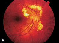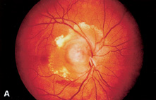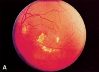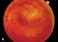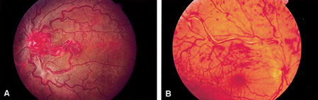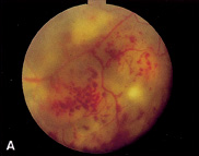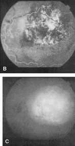 retinovascular features. This syndrome typically affects young healthy individuals with a female preponderance. Despite the significant retinal findings, patients often are asymptomatic at presentation. In the largest series of 10 patients, all three features described by the acronym IRVAN were required for diagnosis.133 This includes the presence of numerous aneurysmal dilations of the optic nerve head and retinal arterioles at or near their major branching sites. The aneurysms measure between 75 and 300 μm in diameter and may have a triangular, Y-shaped or coiled configuration. Aneurysmal changes at the optic nerve head may be associated with ectatic changes and apparent elongation of the adjacent arteries (Fig. 15A). The vascular abnormalities in IRVAN have a propensity to leak, leading to exudative retinopathy, but do not have a predisposition to hemorrhage. Subretinal, intraretinal, or vitreous hemorrhage secondary to aneurysms has not been associated with IRVAN. This is contrasted with senile acquired macroaneurysms, which occur in older individuals with systemic hypertension, are round, and may be associated with either hemorrhage or serous exudation. IVFA is useful to delineate aneurysmal changes in IRVAN. Vasculitis is demonstrated by staining of the arterial and venous walls on IVFA, and the arterioles appear to be more severely affected (see Fig. 15B). Neuroretinitis is manifested clinically as optic nerve head swelling and as late diffuse staining of the optic nerve head on IVFA. Extensive peripheral retinal capillary nonperfusion with sequelae of retinal ischemia, such as neovascularization of the retina or anterior segment, may occur. Vitreous hemorrhage may occur secondary to retinal neovascularization. Vitritis has been described in IRVAN and may be accompanied by anterior uveitis. IRVAN is differentiated from Bales' disease, which has a predilection for young male patients, an association with tuberculin hypersensitivity, more marked uveitis, retinal venous inflammation, and a lack of multiple macroaneurysms.133 Although some cases of IRVAN maintain good visual acuity, severe visual loss may result from exudative maculopathy or sequelae of retinal ischemia. Extensive medical investigations have not revealed any systemic associations. Systemic corticosteroids do not appear to have a beneficial effect on uveitis or retinal ischemia. There is limited experience regarding laser photocoagulation to aneurysms to treat eyes with exudative retinopathy threatening the fovea. Branch artery occlusion was described in one case after laser photocoagulation to a single aneurysm.133 Chang and colleagues recommend observing eyes without retinal neovascularization and performing panretinal laser photocoagulation for eyes that have developed retinal neovascularization or have signs of rapidly progressive anterior segment ischemia.133 Vitrectomy has been performed for eyes with persistent vitreous hemorrhage. |