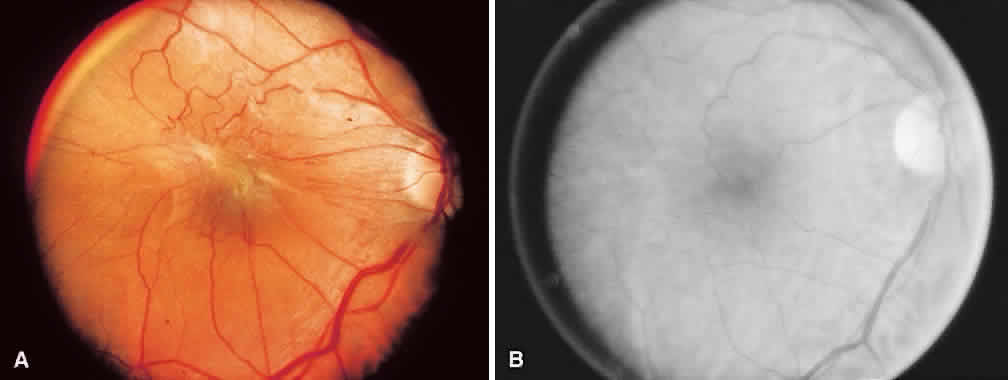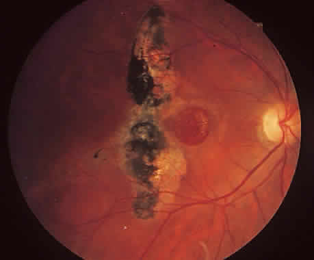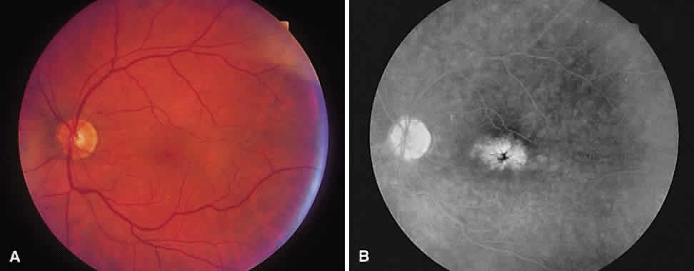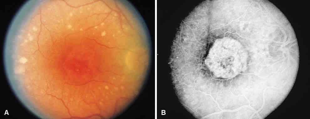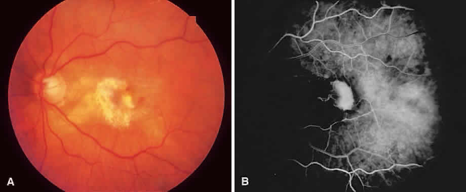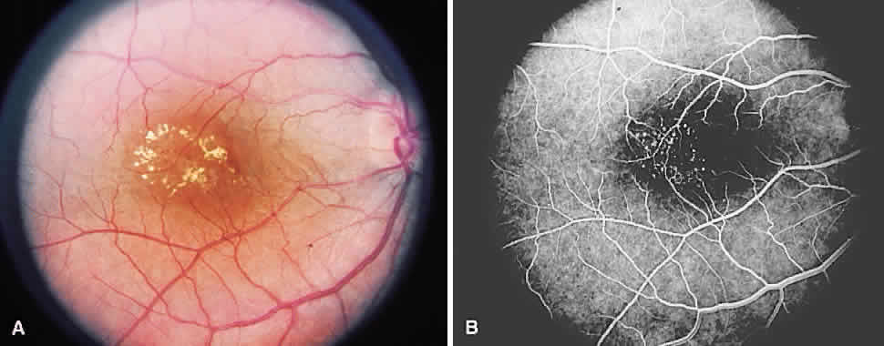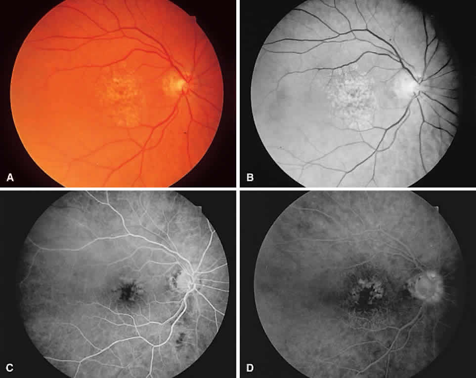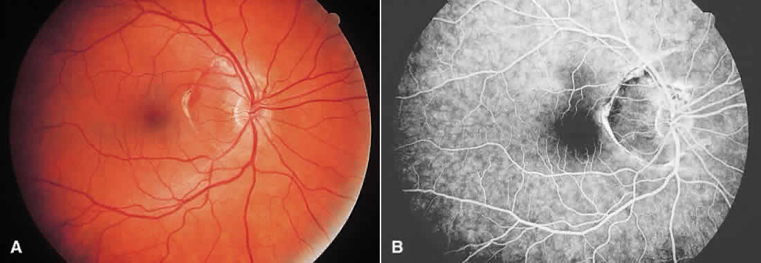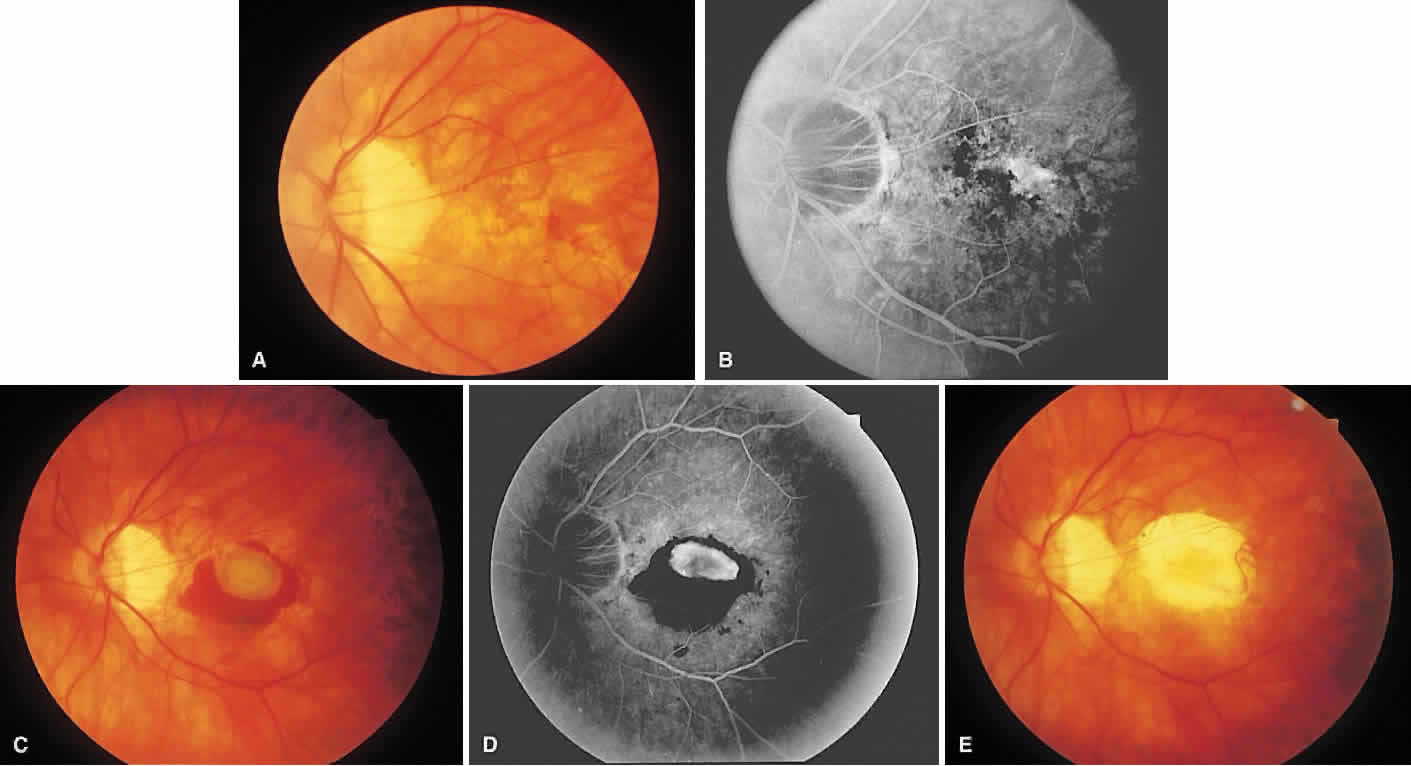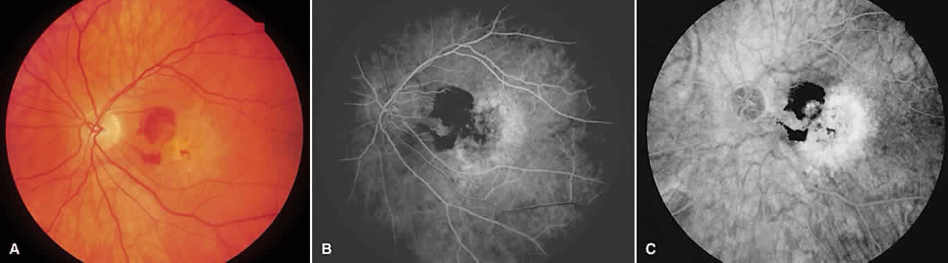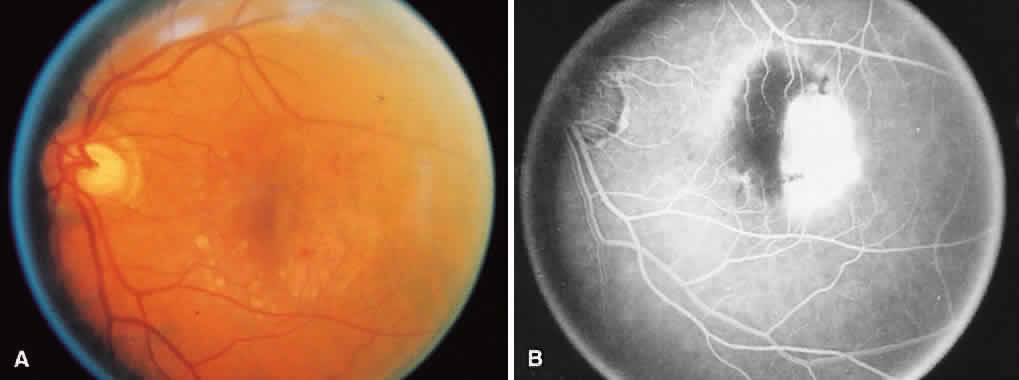 HISTOPLASMOSIS The presumed ocular histoplasmosis syndrome is a major cause of visual impairment in the central and eastern United States, especially in the Ohio and Mississippi River valleys. Histoplasma capsulatum is a dimorphic soil fungus that is acquired through the respiratory tract and usually results in an asymptomatic, self-limited infection, but it can develop into a disseminated infection in immunocompromised persons.100,101 Presumed ocular histoplasmosis syndrome has been clinically linked to H. capsulatum, even though organisms are usually not found in autopsied eyes of patients known to have the disorder. The triad of ocular findings in histoplasmosis comprises peripheral, punched-out, atrophic choroidal lesions; peripapillary choroidal scars; and macular lesions with or without SRNV. The peripapillary disc scarring consists of choroidal and RPE atrophy, with a line of pigment at the disc margin of the scar, as opposed to some normal eyes with optic nerve crescents that have pigment at the outer border of the scar. The active lesion of histoplasmosis is a small round area of choroiditis that can create a small overlying sensory retinal detachment. This picture can be difficult to differentiate from active SRNV. The areas of active choroiditis are not associated with vitreous cells. The lesions become quiet and create atrophic, and later pigmented, scars called histo spots, which appear symptomatically during the patient's lifetime. SRNV may be associated with a previous area of histoplasmosis scarring (Fig. 15). The visual prognosis is poorer for eyes with SRNV and a perifoveal choroidal scar in the fellow eye. If such a scar exists, there is a 20% to 25% chance of the development of a neovascular membrane in 5 years; without such scars, there is only about a 4% chance of SRNV developing from the scarring around the disc.102,103 A follow-up evaluation of patients in the MPS showed that choroidal neovascularization is often preceded by an atypical histo spot.104 Macular SRNV, however, has been described in the absence of preceding atrophic scars.105 Prognosis for vision remains good: 81% can be expected to have 20/20 or better acuity after 5 years when the fellow eye has had CNV.104 Laser treatment has been shown to be an effective treatment of SRNV associated with presumed ocular histoplasmosis syndrome and located 200 μm or more from the center of the foveal avascular zone.106 In the ocular histoplasmosis section of the MPS, 34% of untreated eyes versus 9% of treated eyes suffered severe visual loss of six or more lines after 18 months of follow-up. Corticosteroids are not believed to be of benefit for the associated SRNV. Subretinal surgery for the removal of subfoveal CNV has been performed in ocular histoplasmosis. Berger and colleagues107 reported that acuity improved by two lines in 35%, was unchanged in 44%, and worsened in 21%. Recurrence of the subfoveal CNV occurred in 38% and was more common in eyes that had undergone preoperative laser photocoagulation. The median time to recurrence was 5 months. Perfusion of the subfoveal choriocapillaris may have implications for visual improvement after subfoveal surgery.108 If subfoveal membranes have an extrafoveal ingrowth site, the prognosis is better for visual recovery as opposed to a subfoveal or unidentifiable ingrowth site.109 Melberg and colleagues110 studied recurrences and found that recurrent lesions were extrafoveal in 16%, juxtafoveal in 18%, and subfoveal in 66%. These eyes were treated with laser photocoagulation, further subfoveal surgery, or observation. Eyes amenable to laser did better in terms of vision. The differential diagnosis of presumed ocular histoplasmosis syndrome includes a group of diseases of unknown cause that create multifocal choroidal scarring and are known variously as recurrent multifocal choroiditis, punctate inner choroidopathy, multifocal choroiditis with progressive subretinal fibrosis, and pseudohistoplasmosis.111–114 Many patients who have these diagnoses also have associated vitreous inflammation, and the pattern of scarring changes with time more than in presumed ocular histoplasmosis syndrome. MYOPIA Degenerative, or pathologic, myopia is one of the leading causes of blindness in the world.115 The chorioretinal lesions that accompany myopia have been attributed either to progressive axial elongation or to a genetically determined atrophic process independent of anatomic eye wall changes.116–118 The myopic disc is oval, with a long vertical axis, and may appear tilted or oblique; it often has a temporal concentric area of depigmentation, called a temporal crescent. Posterior pole staphyloma may be present early in life, and its incidence increases with age.119 The sensory retina, RPE, and choroid are thinned, and the underlying choroidal vessels are prominent (Fig. 16). Chorioretinal atrophy may be extensive and may appear as round or irregular yellow-white areas with focal deposits of pigment.