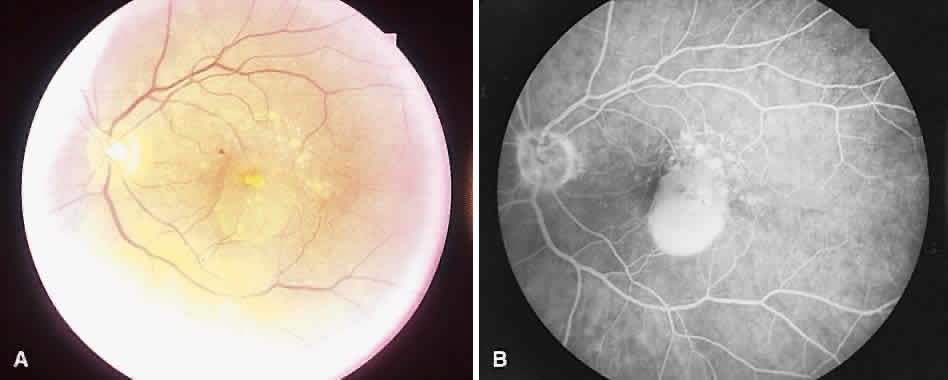 with hypertension. Clinically, there are two characteristic findings. A sub-RPE vascular branching network is usually located in the area of the papillomacular bundle but can be isolated below the fovea. Reddish-orange nodules, called choroidal excrescences, are found at the edge of the vascular networks. Recurrent exudation and hemorrhage can occur under the RPE or retina (Fig. 34). Breakthrough bleeding into the vitreous is possible. Over time, the orange masslike lesions flatten with resolution of the leakage. New tubular vessels emanate from the flattened orange lesion. Fluorescein angiography shows filling of IPCV lesions with the choroidal vasculature. There is blocked fluorescence due to hemorrhage, exudate, or the RPE. IPCV vessels can leak, although not as much as in a choroidal neovascular membrane seen in AMD. The polypoid structures are hyperfluorescent and stain or leak on late frames. Indocyanine green angiography shows that IPCV vessels fill slower than choroidal vessels. The network of abnormal vessels is also larger than suspected clinically. The polypoid structures leak dye slowly.308 Vision is typically better in IPCV than in AMD, and vision can be improved with treatment of the lesions. In some cases, scarring can occur with attendant visual loss. Treatment is carried out to areas of leakage from the choroidal excrescences. Unlike in AMD, the entire complex need not be treated in IPCV. IPCV can be differentiated from AMD in the following ways. AMD patients are usually white. They usually have typical drusen and RPE changes that are often bilateral. The vessels seen in CNV due to AMD are not clinically visible. There is frequent scarring in AMD.308–311 |
