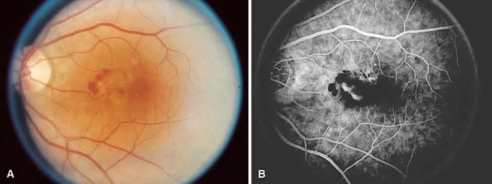 Atrophic macular degeneration may evolve in several ways. Areas of RPE atrophy often follow the fading of drusen. Dystrophic calcification may also be seen in soft drusen. Eventually, the overlying RPE atrophies.21 Initially, these areas form discrete patches of atrophy that coalesce with time. The areas initially affected usually involve the perifoveal area and spread around the fovea, preserving central vision. However, in most cases, with time the fovea is involved and central vision is lost.7,39 Macular atrophy may occur in the absence of faded drusen. The RPE atrophy may be preceded by a reticular configuration of pigment clumping. The atrophy tends to expand more rapidly in all other directions than toward the fovea.39 However, although the fovea shows a certain amount of resistance to the expansion of atrophy, it is ultimately involved, and in most cases central vision is lost. Occasionally, a bull's-eye ring of atrophy surrounds the fovea before the center is involved. This foveal sparing may be due to an accumulation of lipofuscin in the posterior pole or possibly to the presence of xanthophyll pigment.7 The progression of atrophy is variable, ranging from 15 to 375 μm a year.39 Geographic atrophy may follow the spontaneous or laser-induced collapse of a serous pigment epithelial detachment, especially when formed by a confluence of soft drusen.7,49,33,36,39,49,50 In areas of geographic atrophy, the outer nuclear layer rests directly on the basal lamina. The outer plexiform layer is thinned and vacuolated, but the inner nuclear layer is less affected. The choroidal capillaries remain patent for a time, but in long-standing RPE atrophy, they end abruptly at the end of the atrophic area. The gradual obliteration of the choriocapillaris that follows RPE atrophy can be seen clinically as slow filling on fluorescein angiography that, in time, progresses to nonfilling.51 In cases of long-standing atrophy, choroidal arteries may appear to be sheathed, prompting the name choroidal sclerosis. Histologic examinations, however, reveal only a fibrous replacement of the arterial media, without thickening of the walls; the lumen remains patent.7 Choroidal atrophy occurs secondary to a reduction in nutritional demands of the outer retina. As the choriocapillaris and middle layer of choroidal vessels are lost, the larger choroidal vessels become more prominent. Functional visual loss can result from a ring scotoma, despite good Snellen acuity. It takes approximately 10 years from the onset of atrophic change to reach a level of 20/200, although an interval of 5 years has been observed between the time of atrophic foveal encroachment and the loss of fixation.7,52 Each year, 8% of eyes decrease from 20/50 or better to 20/100 or worse.39 There is a great tendency for the areas of atrophy to become bilaterally symmetric with time. Also, SRNV can develop at the border of atrophic RPE, especially if there is a ring of soft drusen around the geographic atrophy. Because the neovascular response requires the presence of degenerating RPE, the SRNV is almost always found at the edge of atrophy rather than in the center of an atrophic area. SUBRETINAL NEOVASCULARIZATION The Eye Disease Case-Control Study Group showed that there is an increased risk to progression to SRNV if there is a history of cigarette smoking, elevated serum cholesterol, and multiparity.53 A protective effect of carotenoids was also found. Serum levels of vitamins E and C were not associated with the risk of progression to SRNV.54 SRNV refers to the growth of abnormal new vessels beneath the sensory retina or RPE. Choroidal neovascularization, another term for SRNV, emphasizes the choroidal vascular origin of the new vessels.55 SRNV is an abnormality found in many diseases in which the integrity of the RPE, Bruch's membrane, and choriocapillaris has been compromised.56–59 The effect on vision from SRNV derives from its tendency to leak fluid beneath and into the sensory retina, to bleed, and to create a fibrovascular disciform scar in the macular region. Patients with AMD often develop SRNV and initially present with blurred or distorted vision, micropsia, or scotoma.60 Clinically, the subretinal neovascular membrane may appear as a dirty-gray discoloration beneath the retina and may be accompanied by an overlying sensory retinal detachment and cystoid edema. A pigmented ring may encircle the membrane, caused either by RPE hyperplasia or pigment ingestion. Often subretinal or sub-RPE hemorrhage is present. In the absence of retinal vascular disease, trauma, or a choroidal tumor, subretinal hemorrhage should be considered to be caused by SRNV until proven otherwise. Rarely, hemorrhage from SRNV may dissect through the retina to create a vitreous hemorrhage. Occasionally, SRNV can be responsible for a turbid sensory retinal or RPE detachment. Turbidity indicates the presence of proteinaceous exudate, fibrin, and blood, all products of abnormally leaking vessels. Subretinal exudate is also a strong indicator of SRNV. If the RPE overlying the SRNV membrane has become thinned, then the arborized vascular structure of the membrane may be seen.61 The presence of a pigment epithelial detachment may also signal the presence of an SRNV membrane, especially if associated with sensory retinal detachment, subretinal exudate or blood, chorioretinal folds, or an RPE tear.16,17,43 Subretinal or sub-RPE blood in the pigment epithelial detachment is also a sign of associated SRNV. The blood and proteinaceous content in a pigment epithelial detachment stains slowly with fluorescein compared with the rapid angiographic staining of a serous pigment epithelial detachment. Fluorescein angiography is useful in confirming the presence and location of SRNV, which provides information concerning visual prognosis. The early angiogram in classic CNV may reveal a discrete, lacy, arborized plexus of vessels, with a nodular-appearing border (Fig. 7). The edges of 