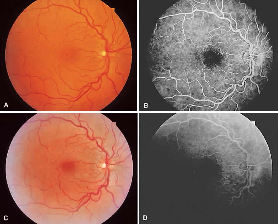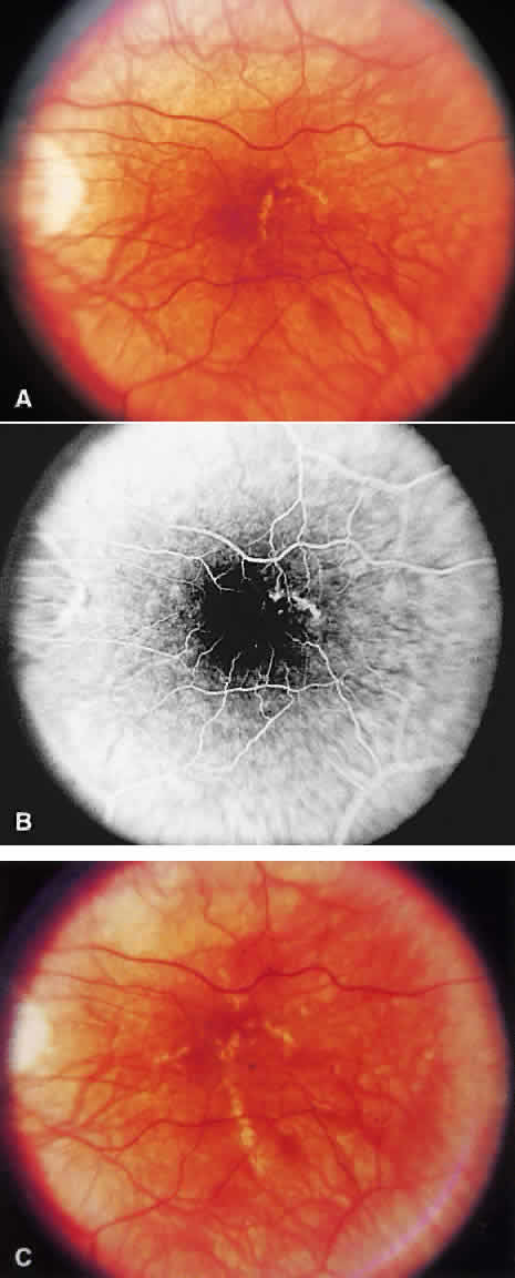 Group 2A is the most common form of IJRT (Fig. 27). The patients are older than in group 1, with an equal incidence of men and women. The disease occurs bilaterally. Gass believed that this is probably an acquired disorder. Visual loss occurs from atrophy of the foveal retina rather than exudation or retinal edema. However, leakage does occur and can be shown angiographically.199 This is centered within 1 disc diameter of the fovea. Patients have metamorphopsia or decreased vision. Gass described five stages in the evolution of this group. The earlier stages are often noted in the less-involved eye of symptomatic patients. Stage 1 involves staining of the vessel wall due to its thickening. This is often in the deep capillary plexus. Green and associates200 showed histologically that there is thickening of the basement membrane with loss of endothelial cells and pericytes, very similar to diabetic vascular change. These capillaries do not adequately carry on metabolic exchange, leading to derangement in retinal function with eventual loss (stage 2). As the outer capillary bed becomes more involved, right-angled venules from the inner retina form to drain the bed (stage 3). Further metabolic compromise leads to loss of photoreceptor cells and consequently a decline in visual acuity. Gass did not explain the role of the RPE in the nourishment of the photoreceptors in relation to this disease. With loss of retinal tissue, a lamellar macular hole may form (stage 4).197,201 This loss of retinal cells induces intraretinal neovascularization, SRNV, exudation, and hemorrhage. RPE cells can form pigment plaques after having migrated into the retina. Development of neovascularization can lead to rapid loss of vision. In Gass' study, no patient had a neovascular complex that was amenable to treatment, either because loss of vision was due to foveal atrophy or the neovascularization was located below the fovea. In Gass' study, patients who were treated before the development of neovascular membranes often did worse. There have been two patients who have had subretinal hemorrhage after laser treatment. These were probably due to SRNV that developed after treatment.197,202 Patients who seem to have group 2A lesions have been treated successfully with laser.203 However, a more recent report of 14 patients204 did not show any improvement or stabilization of vision after parafoveal laser treatment. Retinal hemorrhage, vascularized retinal scars, and RPE changes can develop after laser treatment, but this does not seem to affect visual acuity. Consequently, the treating ophthalmologist and the patient must decide on the best course of action. A stereo-angiogram showing leakage, combined with a recent decline in vision, may warrant a trial of treatment. Untreated, vision may worsen, stabilize, or, rarely, improve. Golden refractile deposits near the inner surface of the retina were seen to occur in the reports by Gass196,197 and Moisseiev and colleagues.205 The number of deposits does not appear to correlate with the degree of visual loss. These may be the footplates of degenerating Müller cells, as Gass suggested, or calcium or cholesterol deposits. Group 2A patients have developed diabetes, and some persons with diabetes have had disease resembling group 2A IJRT. Consequently, a fasting blood sugar may be advisable in these patients. There are few reports of group 2B IJRT occurring in families and affecting younger patients. This group does not show right-angled venules, retinal deposits, or pigmented plaques but does display SRNV. Both patients in Gass' paper were males who had bilateral disease with visual loss to 20/70. Group 3A disease has been seen in women. There is telangiectasis with mild exudation. The major finding is capillary occlusion with enlargement of the foveal avascular zone. Visual acuity, though, is better than would be expected and may be maintained for years. The disease is bilateral, and there can be familial involvement. Arthritis, polycythemia vera, and hypoglycemia can be associated. Interestingly, Mansour and Schachat206 found the foveal avascular zone to be smaller in IJRT; however, they did not use the current classification of IJRT. Because group 2A is the most common form of IJRT, most patients studied probably belonged in this group. Group 3B patients have an enlarged foveal avascular zone with associated central nervous system vasculopathy. They are often men, and the disease can run in families. Thus, all group 3 patients should be evaluated for systemic diseases. IJRT probably represents different diseases. Group 1 is more often associated with leakage and is in the spectrum of Coats syndrome. Group 2 patients display some leakage, but ultimately visual loss is from foveal atrophy. Group 3 is associated with changes in the foveal avascular zone. Photocoagulation is useful in group 1 and often group 2 but would not be beneficial, theoretically, in group 3. Treatment spots are usually 100 to 500 μm and applied as light burns in a grid pattern to the areas of leakage outside the foveal avascular zone. The vessels do not need to be treated directly. Neovascular membranes, when treatable, are treated with confluent, more moderate burns. | ||||||||||||||||||||||||||||||||||||||||||||||||||||||||||||||||||||||||||||||||||||||