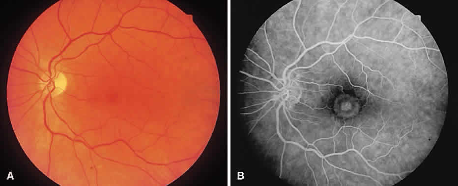 CME and visual loss may develop weeks to years after cataract surgery. This postoperative visual decline was first noted after intracapsular surgery in the 1950s; it was later demonstrated by fluorescein angiography to be due to intraretinal cysts.173–176 These cysts result either from edematous, degenerating Müller cells or from expansion of extracellular spaces in the inner plexiform and inner nuclear layers caused by serous exudate.177–179 The Irvine-Gass syndrome, initially referred to as CME after intracapsular cataract extraction, is often used to describe visually significant CME that follows cataract surgery, regardless of extraction technique or intraocular lens implantation (Fig. 24).