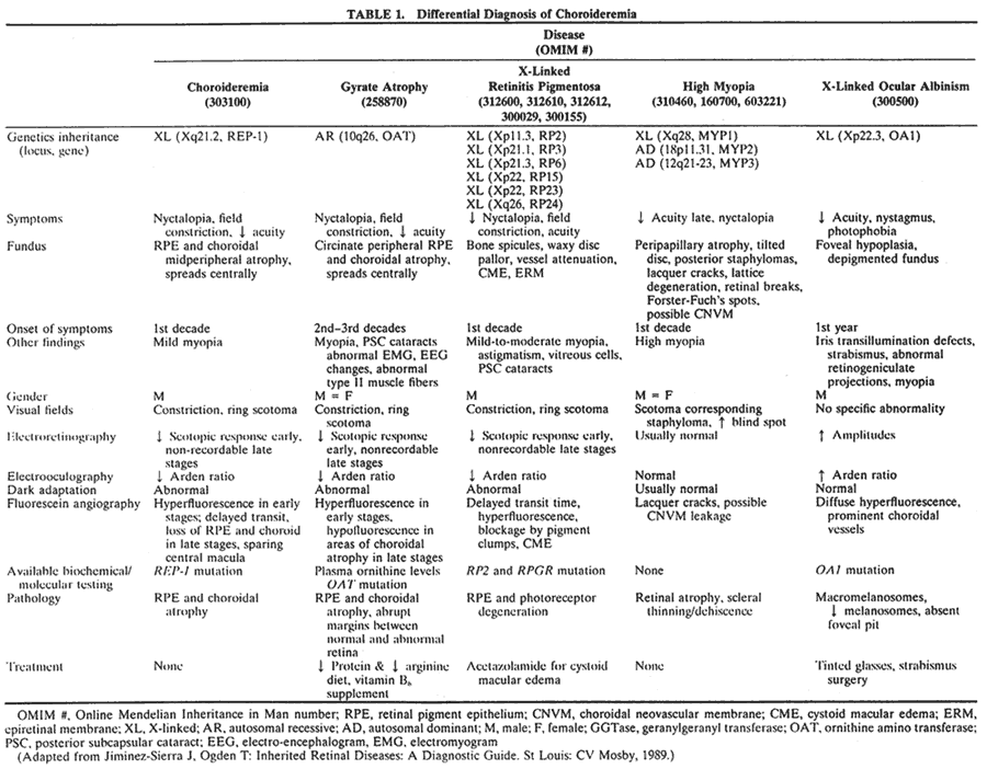1. Mauthner H: Ein Fall von Choroideremi. Berl Nat Med Innsbruck 2:191, 1872 2. McCulloch C, McCulloch R: A hereditary and clinical study of choroideremia. Trans Am Acad Ophthalmol Otolaryngol 52:160, 1948 3. Pameyer J, Waardenburg P, Henkes H: Choroideremia. Br J Ophthalmol 44:724, 1960 4. van den Hurk JA, Schwartz M, van Bokhoven H et al: Molecular basis of choroideremia (CHM): Mutations involving the Rab escort