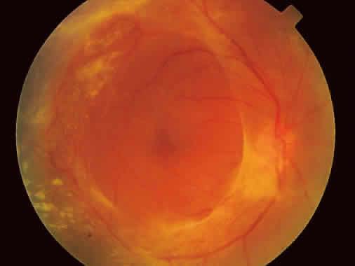 LINCOFF BALLOON Another technique for RRD repair is the temporary use of an inflatable balloon to indent the sclera, choroid, and RPE. The principles of this procedure are analogous to those of scleral buckling. All of the retinal breaks are localized and treated with cryotherapy. Alternatively, laser photocoagulation may be applied instead of cryotherapy; however, as is the case in pneumatic retinopexy, this must be applied in the postoperative period once the retina is reattached. Rather than permanently attaching an inert buckle to the eye, an inflatable balloon is placed in the area of the causative retinal break(s) through a small conjunctival and Tenon's incision and then inflated. After several days, the balloon is deflated and removed.127 This technique avoids some of the long-term complications of scleral buckles such as infection, extrusion, refractive change, and motility disturbances. Nonetheless, the procedure is useful only for detachments with a single break or a closely spaced cluster of breaks, and the single-operation success rate is somewhat lower than for scleral buckling techniques.127–129 This technique tends to be cumbersome for the patient and is not widely used at this time. PRIMARY VITRECTOMY Another useful approach to RRD repair is a primary pars plana vitrectomy. This technique involves internal drainage of the subretinal fluid, a gas-fluid exchange, and laser photocoagulation or cryotherapy of the reattached retina.130,131 Because the vitreous is removed, vitreous traction on retinal breaks is eliminated during surgery. In cases with significant vitreous hemorrhage, this technique allows visualization and treatment of the retinal breaks, which would not be approachable with other techniques. Nonetheless, this technique is generally reserved for more complicated detachments. LASER PHOTOCOAGULATION If a patient is unwilling or physically unable to tolerate a surgical intervention, laser photocoagulation of the attached retina surrounding an RRD may be used to wall off the detachment. Nonetheless, this technique applies to a limited number of patients. Recently, this method has gained popularity in the setting of limited retinal detachments from quiescent cytomegalovirus retinitis.132,133 |