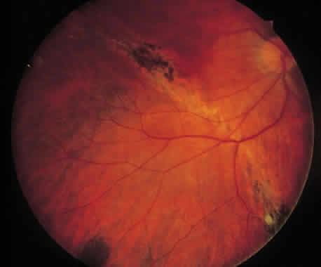 EARLY A recently detached retina loses its transparency and assumes a gray, translucent appearance. Eye movements typically cause the detached retina to undulate in a characteristic manner. Fine, irregular corrugations are usually present and are the result of intraretinal edema.87,88 The fine details of the choroidal vasculature are somewhat obscured by the overlying detached retina (Fig. 9). Within days of an RRD, outer retinal degeneration starts to occur.89,90 The magnitude of the photoreceptor damage that occurs is related to the height and the duration of the RRD.88 At this early stage, the circulation of the inner retina is not affected; thus, the inner retina remains well preserved. If the retina is reattached within a week, most of the cellular changes are reversible.91 RPE cells underlying the RRD can be released into the subretinal fluid and may pass through the retinal break into the vitreous cavity. These cells may be appreciated in the anterior vitreous, where they are known as tobacco dust.87,88,92