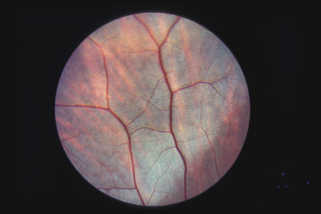 COMMOTIO RETINAE Commotio retinae (Latin, meaning retinal contusion) is a contrecoup injury. It can occur peripherally (Fig. 8) or centrally, in which case it is called Berlin's edema (Fig. 9). Immediately and for several hours after the trauma, the retina appears normal, although the patient may complain of decreased vision. Thereafter, the outer layers of affected retina become opaque. On fluorescein angiography, the opaque retina blocks background choroidal fluorescence, and in most cases there is no leakage into or under the retina (Fig. 10). For years, clinicians had difficulty explaining this blockage, because leakage is expected in conditions with edema. It was then shown in experimental animals and in human autopsy eyes that Berlin's edema is not true edema. The retinal opaqueness is the result of intracellular edema and fragmentation of the photoreceptor outer segments and intracellular edema of the underlying pigment epithelium. There is little or no intercellular fluid.66–69