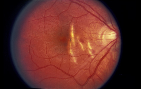 Similar to many conditions that damage Bruch's membrane, choroidal ruptures can, months to years later, be complicated by development of a choroidal neovascular membrane, with serous or hemorrhagic retinal detachment and loss of central vision (Fig. 23).87–89 They usually respond well to laser therapy. Also, studies have demonstrated that subfoveal choroidal neovascular membranes from etiologies other than age-related macular degeneration can benefit from photodynamic therapy.90,91