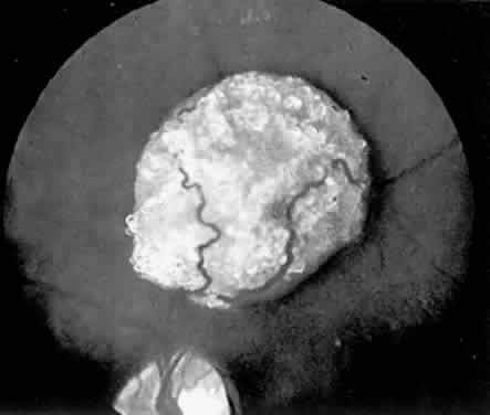 or bilateral retinal cavernous hemangiomas, or both.47,49 The incidence of the syndrome is unknown. The typical retinal cavernous hemangioma is a cluster of small retinal vascular saccules associated with an anomalous and commonly back-branching retinal venule. Most of the lesions are from one disc area to three disc areas in basal size and consist of vascular saccules ranging from pinpoint lesions to lesions about 0.5 mm to 1 mm in diameter. Many lesions have a prominent white fibrous component (gliosis) on ophthalmoscopy. Intraretinal and subretinal exudates are rarely if ever associated with lesions of this type. The vascular lesions can arise within all parts of the retina, from the optic disc to the retinal periphery. The cutaneous vascular lesions that have been identified in patients with this syndrome have typically been cavernous hemangiomas and angioma serpiginosum (progressive widespread dilation of the subpapillary venous plexuses).49,50 The CNS lesions that are associated with this syndrome are cavernous hemangiomas similar in pathologic characteristics to their retinal counterparts.50 These tumors can involve the cerebrum, midbrain, and cerebellum and can lead to seizures, paresis of the upper or lower extremities or of selected cranial nerves, and fatal intracranial hemorrhage. Most affected eyes have good visual acuity throughout life. However, some large retinal cavernous hemangiomas are associated with recurrent intravitreal bleeding,48 and this complication can impair visual acuity. Treatment is not generally indicated, but cryotherapy and diathermy have been used to treat some larger lesions complicated by vitreous hemorrhage. |