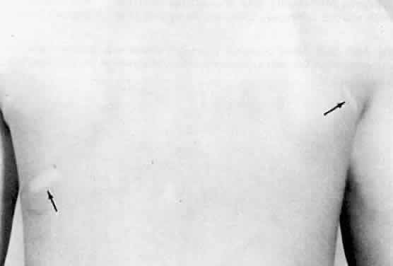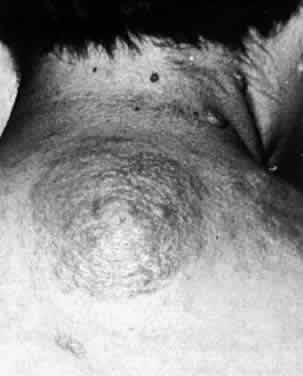 Lesions similar to those that occur in the retina commonly develop in the cerebrum and less commonly develop in the basal ganglion, brain stem, and cerebellum. Both retinal and central nervous system (CNS) lesions can be calcified and identified radiologically.9 Epilepsy and mental deficiency are common in severely affected individuals, and early death occurs in occasional patients as a result of progressive CNS tumor expansion or status epilepticus.5 A variety of unusual tumors develop in the heart, kidney, lungs, thyroid, and other visceral organs in some patients with tuberous sclerosis.5 The classic cardiac tumor is the rhabdomyoma, which can lead to conduction abnormalities, heart failure, and premature death. Angiomyofibromas tend to develop in the kidney, and these lesions can lead to death from renal failure. Several cutaneous lesions are prominent features of tuberous sclerosis. Adenoma sebaceum is an unusual facial dermatologic eruption characterized by pinhead- to pea-sized yellowish to reddish-brown papules distributed in butterfly fashion over the nose, cheeks, and nasolabial folds (Fig. 2). Histopathologically, the individual skin lesions are angiofibromas.10 Ash leaf spots are congenital white or hypomelanotic skin macules ranging from about 1 mm to several centimeters in diameter and having a configuration resembling an ash leaf (Fig. 3). These lesions are most easily demonstrated under ultraviolet light (Wood's lamp).11 The shagreen patch is a thickened patch of skin with the texture of pigskin or sharkskin, usually occurring over the lower back (Fig. 4). Subungual fibromas are benign fibrous tumors that develop at the sides of the nail beds in some patients.