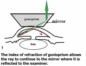 | Classically, gonioscopy involves viewing the chamber angle through a goniolens
