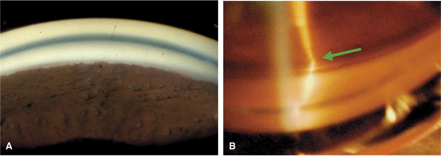 of what is seen is a separate issue. There are three available alphanumeric grading systems to record angle findings (Table 3). It is insufficient only to use the terms open or closed because this does not communicate enough useful information to make meaningful clinical decisions. Biometric gonioscopy is an attempt to quantitate gonioscopy but has not gained widespread acceptance.19 The Scheie system is based on visible angle structures (Fig. 10A).20