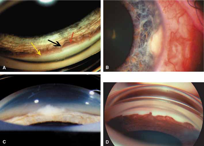 The Shaffer system is based on the width of the angle recess (see Fig. 10B and Table 2).21 The Spaeth nomenclature is a hybrid alphanumeric arrangement (see Fig. 10C to 10F).22 This system prompts the examiner to describe the angle in a three-dimensional manner. This allows total reconstruction of the angle by anyone who understands the nomenclature. For example, a grade IV Shaffer angle is wide open and a Spaeth D40p is also wide open. However, even though they are both wide open, the Spaeth system reveals a plateau configuration that requires closer scrutiny. Grade the following angles (Fig. 11). | |||||||||||||||||||||||||||||||||||||||||||||||||||||||||||||||||||||||||||||||||||||||||||||||||||||||||||||||