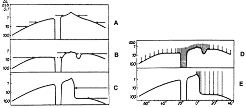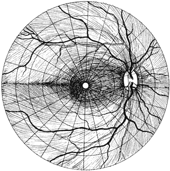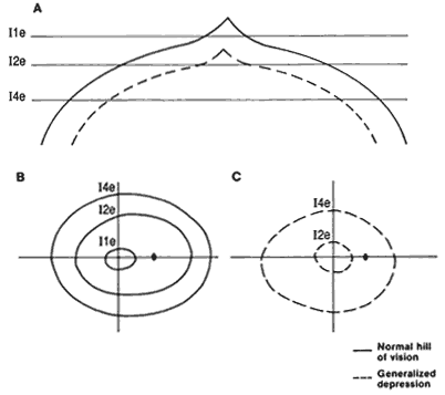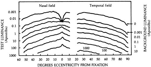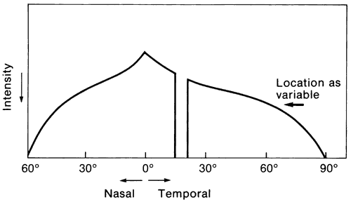 The contour of the island of vision relates to both the anatomy of the visual system and the level of retinal adaptation. The highest concentration of cones is in the fovea; most of these cones project to their own ganglion cell. This one-to-one ratio between foveal cone and ganglion cell results in maximal resolution in the fovea. The sharp-peaked island of vision described by Traquair reflects the visual field in the light-adapted or photopic visual field. The contour of the island of vision changes greatly in the mesopic (twilight) and scotopic (dark-adapted) states. As one proceeds from a photopic to a scotopic state, overall retinal sensitivity increases as rod, rather than cone, vision predominates. In the dark-adapted island of vision, the contour is flatter than in the light-adapted state, and a central depression, rather than a central peak, exists in the area of the fovea. Thus, the level of retinal adaptation is crucial in defining the contour of the island of vision (Fig. 3).2 |