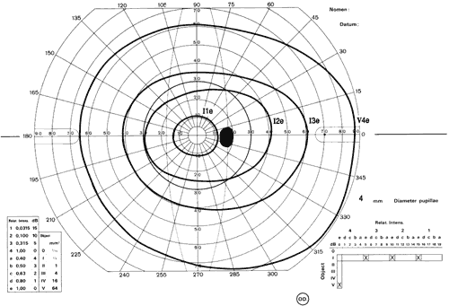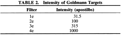 The number and letter represent the intensity of the stimulus. A change of one number represents a 5-dB (0.5 log unit) change in intensity, and each letter represents a 1-dB (0.1 log unit) change in intensity (Table 2). The dynamic range of the Goldmann perimeter from the smallest/dimmest target (Ola) to the largest/brightest target (V4e) is greater than 4 log units, or a 10,000-fold change.