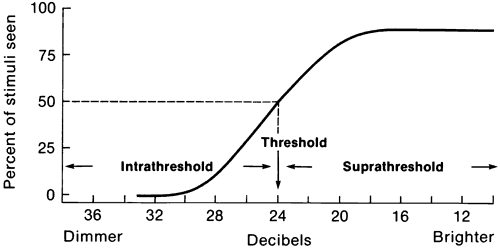 locations are tested. Computerized static perimetry provides an estimate of the reliability and variability of the test. Data storage is possible, and computer-assisted statistical analysis is available.5 The most widely used automated perimeters are manufactured by Humphrey Instruments. Other perimeters also provide comparable thresholding tests; testing strategies and statistical analyses vary between instruments. Most automated perimeters perform a wide variety of programs so that examinations can be tailored to the needs of individual patients. DIFFERENTIAL LIGHT THRESHOLD Static computerized perimetry measures retinal sensitivity at predetermined locations in the visual field. These perimeters measure the eye's ability to detect a difference in contrast between a test target and the background luminance. The differential light threshold is designated as the dimmest target seen 50% of the time. Suprathreshold stimuli are brighter than threshold stimuli, and they are seen more than 50% of the time. Infrathreshold stimuli are dimmer than threshold stimuli are seen less than 50% of the time. Threshold at a specific retinal location can be measured directly from a frequency-of-seeing curve, which is generated by testing one retinal location multiple times with different stimulus intensities. The frequency-of-seeing curve is the graph of the percentage of stimuli seen at each intensity level. Threshold is read from the graph at the 50th percentile (Fig. 8).
