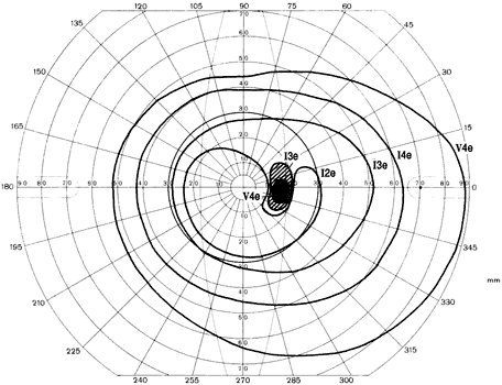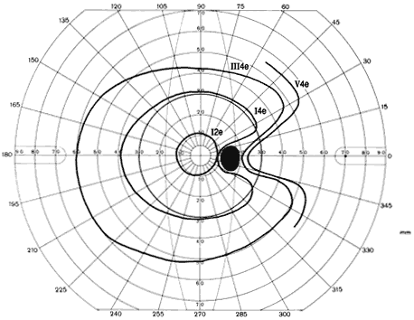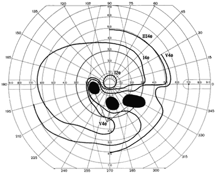 More than 100 combinations of size and intensity are available, but only a few isopters are needed to define the visual field. Size 0 generally is omitted because results of the plots are inconsistent. The fine-intensity filter is usually set to the letter e, which eliminates the small-increment light filters. A change of one number of intensity is roughly equivalent to a change of one roman numeral of size. Isopters in which the sum of the roman numeral (size) and number (intensity) are equal can be considered equivalent. For example, the I4e isopter is roughly equivalent to the II3e isopter. The equivalent isopter combination with the smallest target size is usually preferred because detection of isopter edges is more accurate with smaller targets. One usually starts by plotting small targets with dim intensity (I1e) and then by increasing the intensityof the target until it is maximal before increasingthe size of the target. The usual progression thenis I1e→I2e→I3e→I4e→II4e→III4e→IV4e→V4e (Fig. 6). In addition to plotting isopters kinetically, static suprathreshold and threshold testing can be performed manually. After an isopter has been plotted, the stimulus used to plot the isopter is used to test statically within the isopter to look for localized defects. In this way, it acts as a suprathreshold stimulus. Static thresholds also can be determined along set meridians to obtain profile plots of the visual field, but like any multiple thresholding task, it is time consuming. Manual kinetic perimetry allows fast, flexible, comprehensive evaluation of the entire visual field. However, shallow scotomas can be missed and isopters may be hard to define if the slope of the island of vision is not steep (Fig. 7). The quality of the field test is highly dependent on the skill of the perimetrist. Results from different perimetrists can vary greatly. |