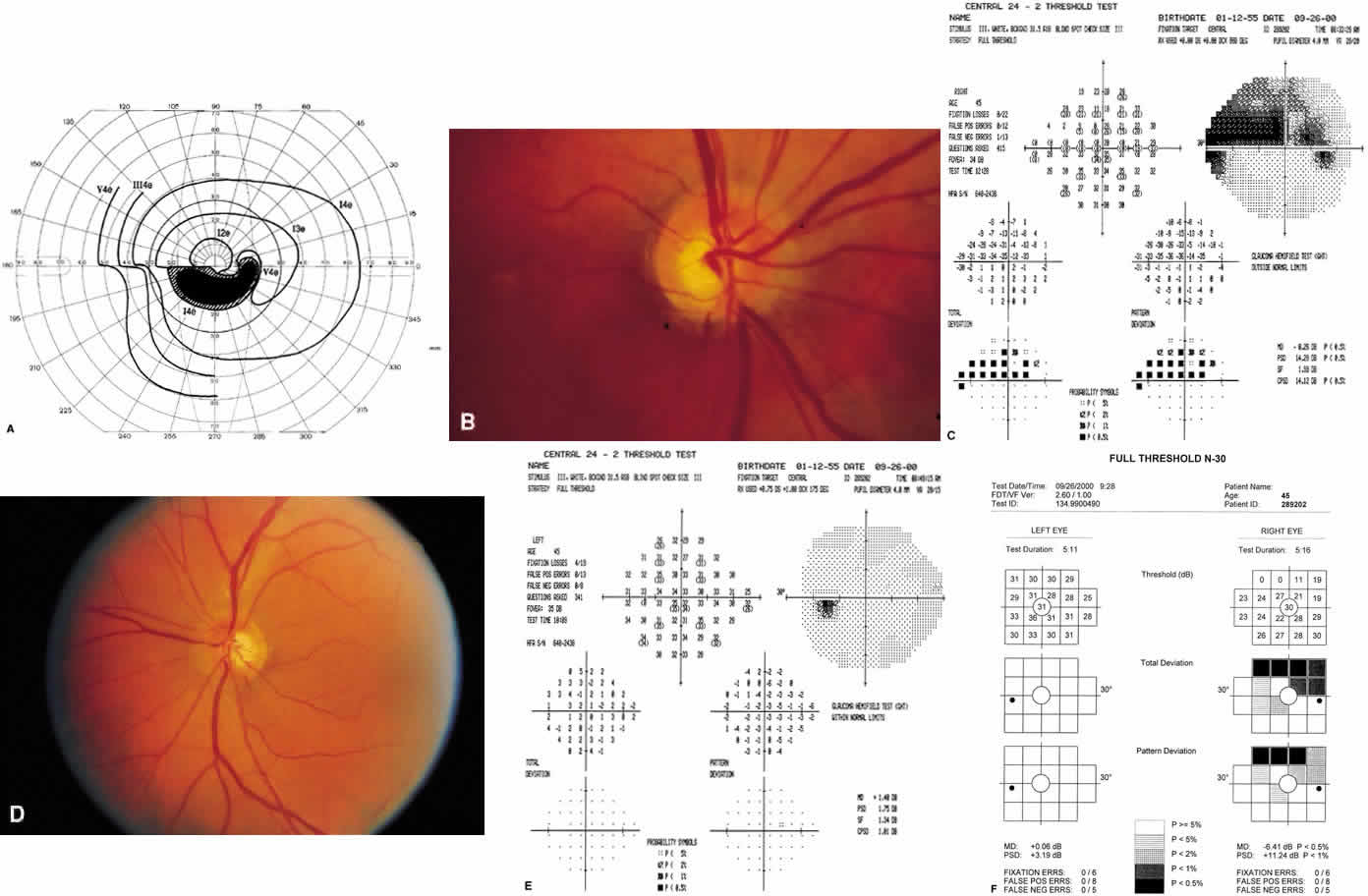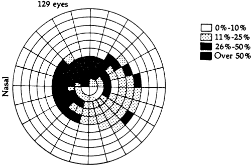 by inconsistent or fluctuating responses in that area.9,10 Initial localized visual field defects may be either relative or absolute. In 35 eyes