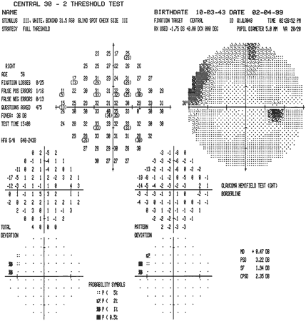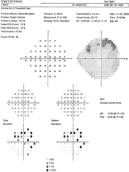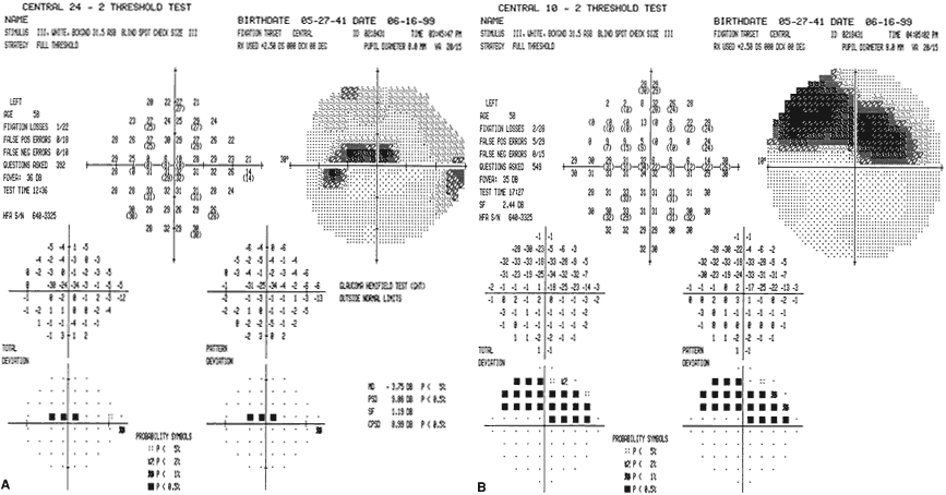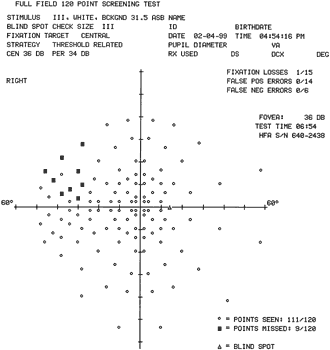 The gray scale is not useful in interpreting SWAP visual fields; SWAPac on the Humphrey is required to correctly interpret the data. Frequency Doubling Technology Frequency doubling technology (FDT) tests the magnocellular pathway. These large diameter fibers make up about 3% to 5% of retinal ganglion cells. Full threshold FDT tests can be completed in less than 6 minutes per eye, and suprathreshold screening can be completed within 1 minute. Results are significantly correlated to testing done using the HFA20 (Figs. 23 to 25). In FDT perimetry, 17 regions are tested within the central 20 degrees of the visual field. Each stimulus is a series of black and white bands that flicker at 25 Hz. A normal eye perceives the illusion of twice the number of bands more closely spaced. Glaucomatous eyes have diminished contrast sensitivity as a result of preferential damage to the My cells and they thus require higher contrast to detect the frequency doubling illusion.24 FDT has been found to have up to 97% sensitivity and specificity for detecting glaucomatous defects.25 EVALUATING THE PATIENT WITH GLAUCOMA Deciding which visual field test to order must be made on a case-by-case basis. The central 24 degrees or 30 degrees automated field test is the most useful test in most glaucoma patients, but it is not necessarily appropriate or ideal for every patient. Central Thresholding Programs Most field testing should concentrate in regions known to be defective. In glaucoma, most defects occur within the central 30 degrees. Defects respect the horizontal meridian, so that routine central programs have test locations positioned on either side of the horizontal meridian rather than on the meridian itself. Commonly used programs for glaucoma are the Humphrey models 24-2 and 30-2. A Humphrey program 30-2 is shown in Figure 19 and a program 24-2 is shown in Figure 17. These programs test the central 24 degrees or 30 degrees with 6 degrees of separation between locations. Humphreyprogram 24-2 eliminates the most peripheral ring of test locations from program 30-2, except in the nasal step region. This is advantageous because the peripheral ring of thresholds provides the least reliable data, and testing time can be shortened. Full threshold or SITA standard strategies can be used with either the Humphrey 24-2 or 30-2 programs. Thresholding programs are essential for accurately detecting glaucomatous visual field defects and following patients for progressive damage. Thresholding programs can detect early diffuse depressions of the visual field. Thresholding programs can detect changes in scotoma depth, which is the most common mode of progression. Thresholding programs also permit calculation of the short-term fluctuation, which facilitates the interpretation of field defects. Full threshold or SITA standard canbe used. SITA standard has virtually replaced Fast-pac because it provides more reliable data in a shorter time. Central 10 Degrees A program such as the Humphrey 10-2 that uses tightly spaced locations in the central 10 degrees is preferable to a 24- or 30-degree program in two situations. If a localized defect is detected within 10 degrees of fixation on a standard central test, a 10-degree program can help determine how close to fixation the defect extends (Fig. 26). If the patient has advanced defects, a small central island can be tested with a 10-degree program; the higher resolution provides more data points for follow-up and patient anxiety can be reduced by limiting testing to seeing areas.