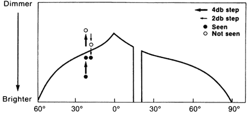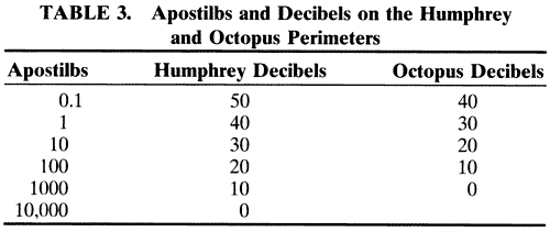 Unfortunately, it is impractical to perform frequency-of-seeing curves at the large number of locations required to assess the visual field accurately for glaucomatous damage. Therefore, different perimeters use various strategies to estimate threshold. These strategies are described later in this chapter under Automated Perimetry: Testing Strategies: Threshold Programs. APOSTILBS AND DECIBELS In perimetry, luminance of test targets is measured in apostilbs. An apostilb is an absolute unit of luminance that is equal to 0.3183 candela/m2, or 0.1 millilambert. The decibel scale is a relative scale created by the manufacturers of automated perimeters to measure the sensitivity of the island of vision. It is an inverted logarithmic scale. Zero decibels is set as the brightest stimulus that the perimeter itself can produce. The decibel scale is not standardized because the maximal luminance varies between instruments. Table 3 shows the relationship between apostilbs and decibels in the Humphrey and Octopus perimeters. Zero decibels corresponds to 1000 asb in the Octopus perimeter and 10,000 asb in the Humphrey Field Analyzer (HFA). A change of 10 dB equals a 1 log unit or tenfold change in intensity, and 1 dB is equivalent to 0.1 log unit.